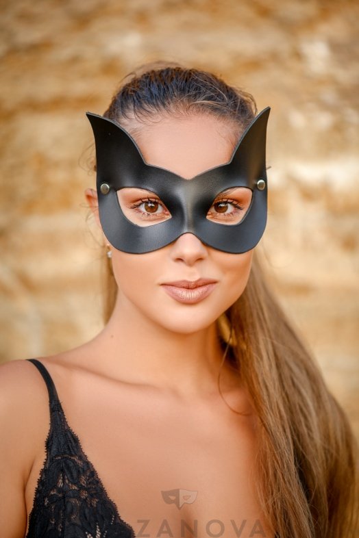 Маска с ушками из коллекции «Арсенал» изготовлена из натуральной кожи и декорирована металлическими элементами.