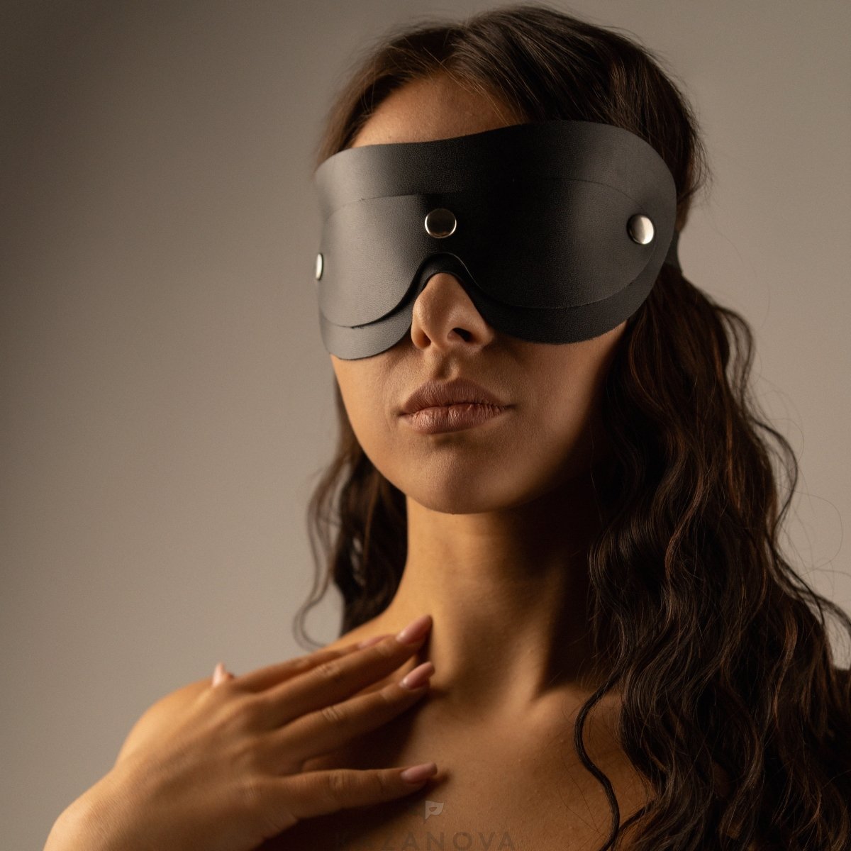 Черная маска изготовлена из натуральной кожи. В комплект входят съемная шторка для зрительной депривации.