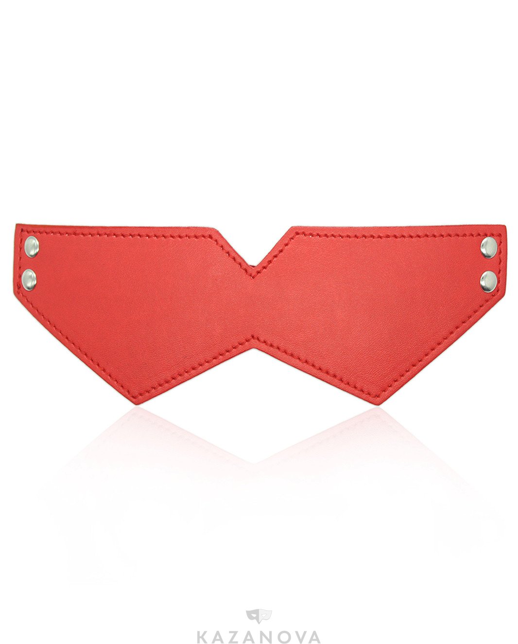 Красная маска изготовлена из искусственной кожи и декорирована заклепками из металла. Размер универсальный, аксессуар подстраивается под индивидуальные параметры. Маска не пропускает свет и идеально подходит для зрительной депривации.