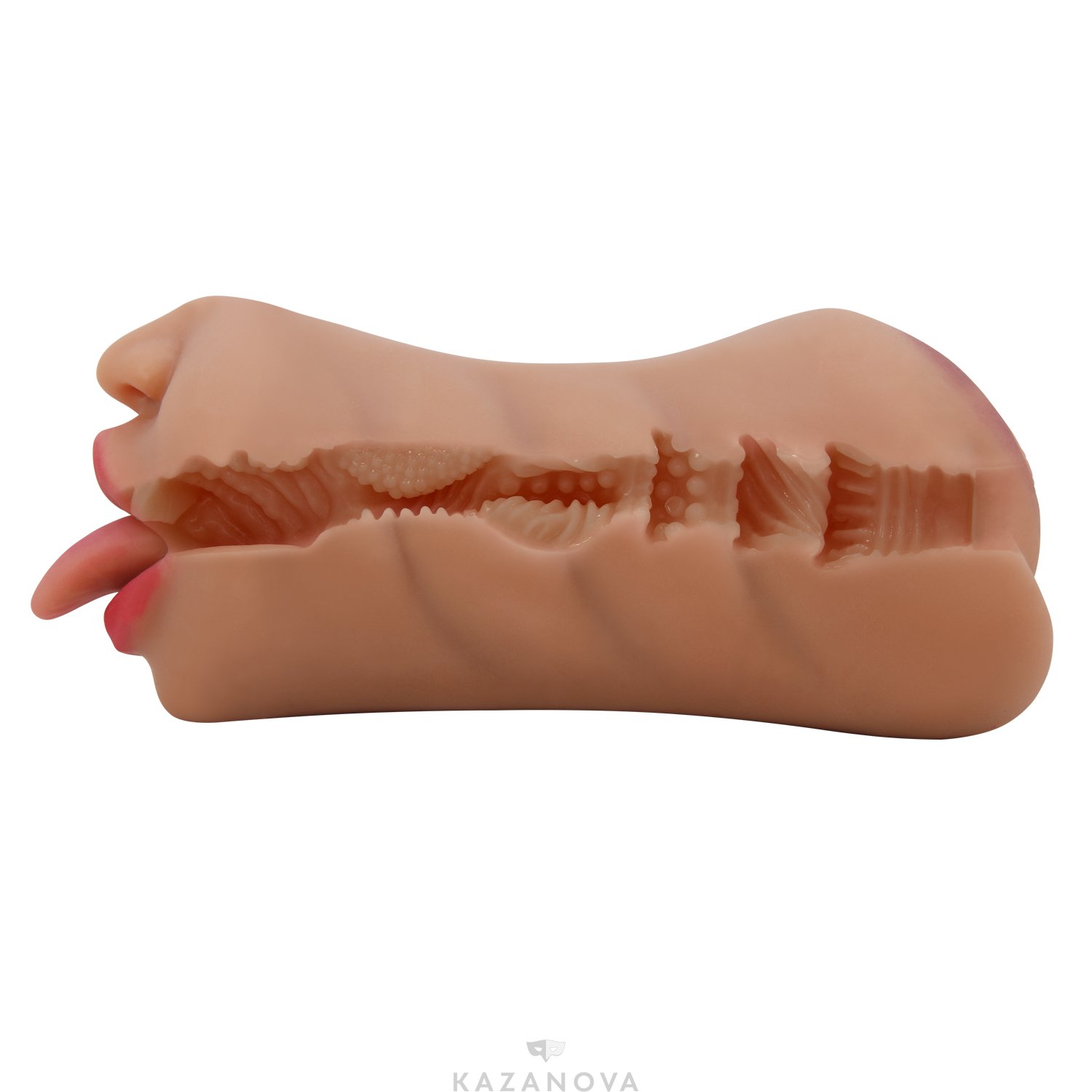 Мастурбатор с двумя реалистичными входами в виде вагины и рта. Манжета плотно обхватывает половой член, а чувственный внутренний рельеф воздействует на каждый рецептор и стремительно приближает один из лучших оргазмов.
