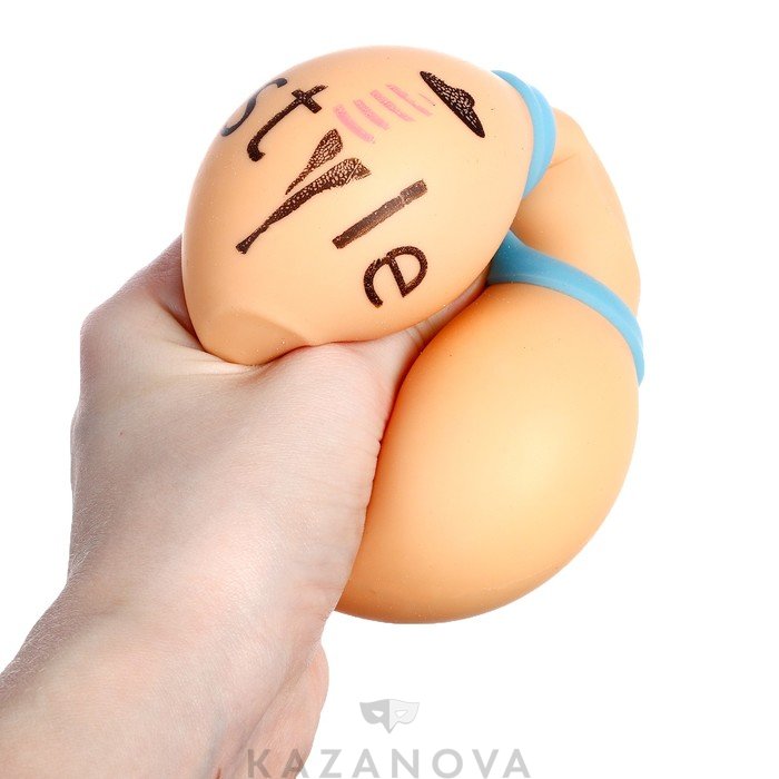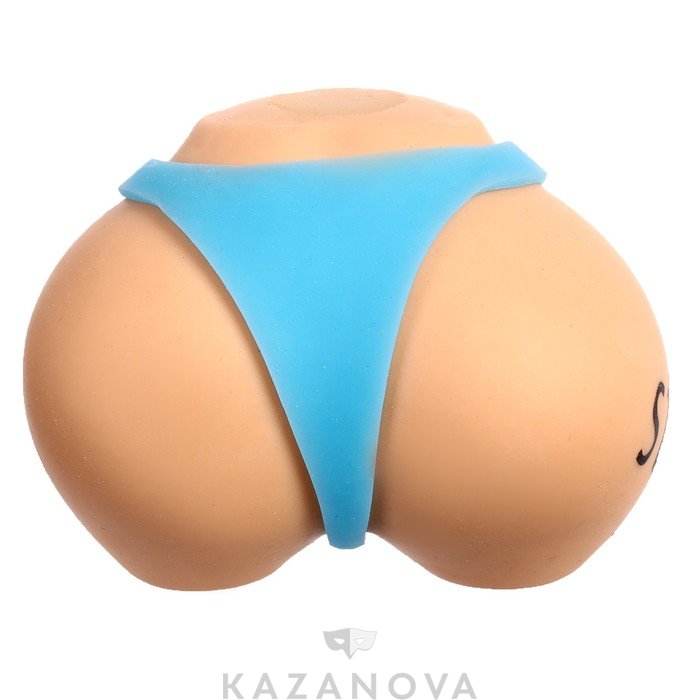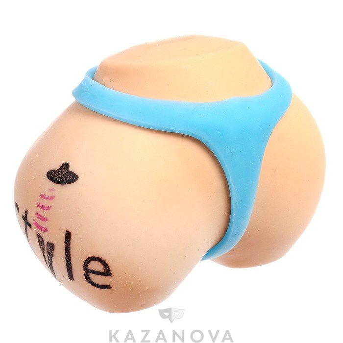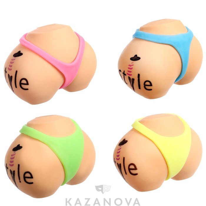 Игрушка изготовлена из ткани с мягким наполнителем внутри и выглядит, как упругие бедра со стрингами.