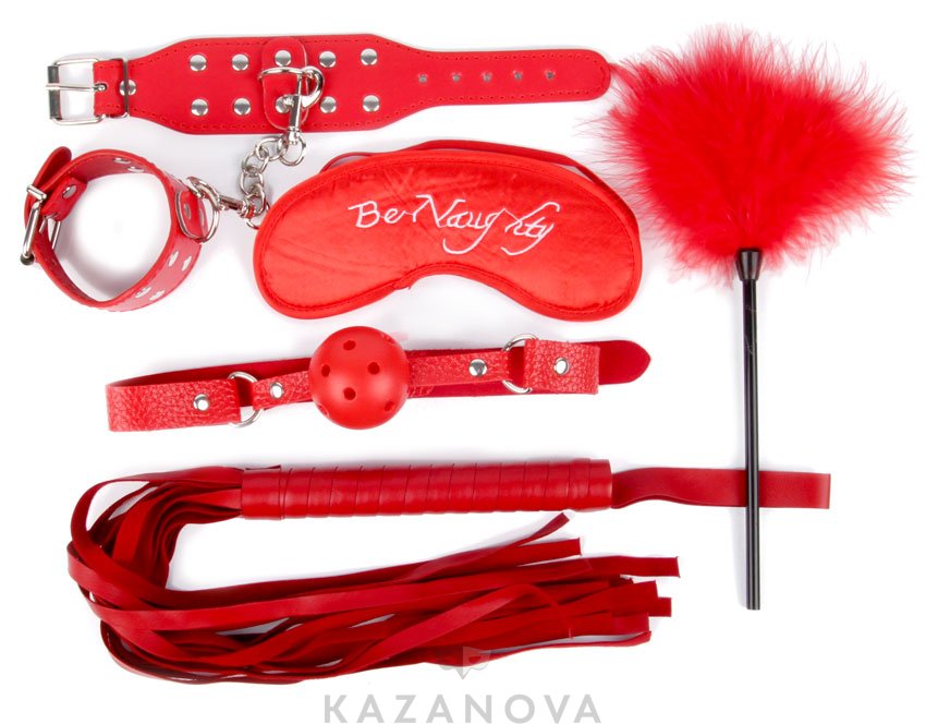 Набор БДСМ: наручи, маска, кляп, флогер, щекоталка красный
