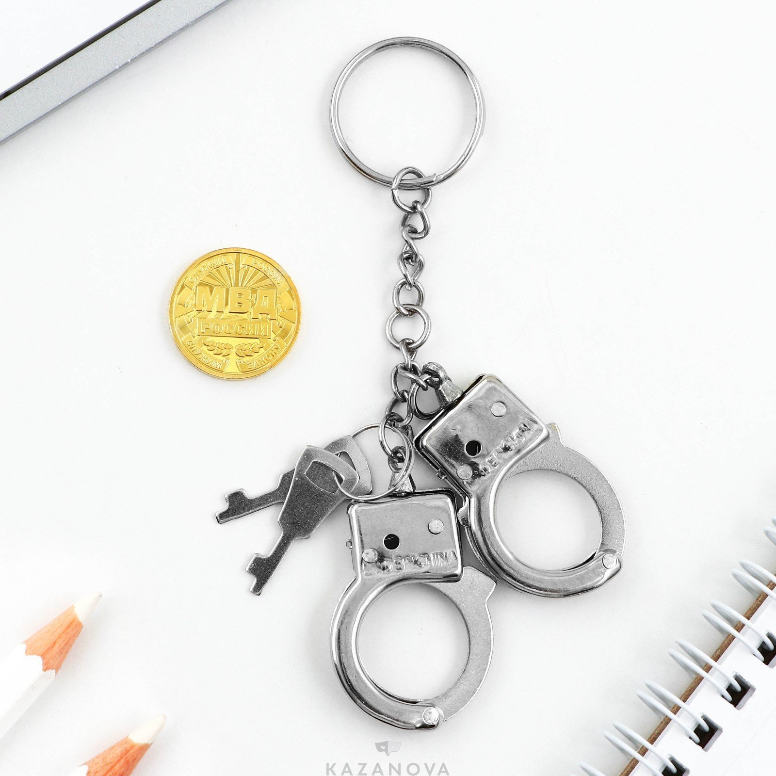 В набор входят миниатюрные наручники и монета.