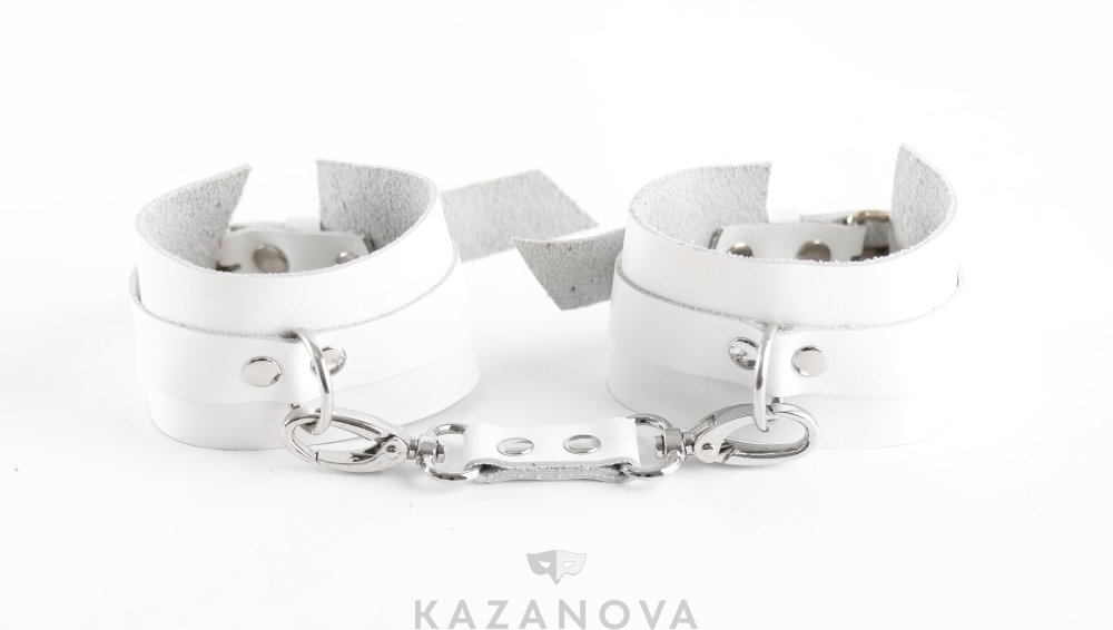 Наручи белого цвета изготовлены из качественной натуральной кожи превосходного качества. Соединяются с помощью короткой цепочки и карабинов, легко регулируются по размеру.