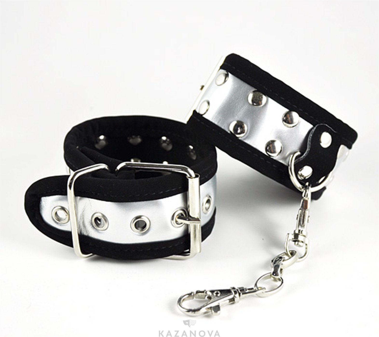 Черные наручники с серебристым декором идеально подходят для бондажа и фиксации.