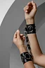 Наручники изготовлены из натуральной кожи черного цвета и декорированы металлическими элементами.
