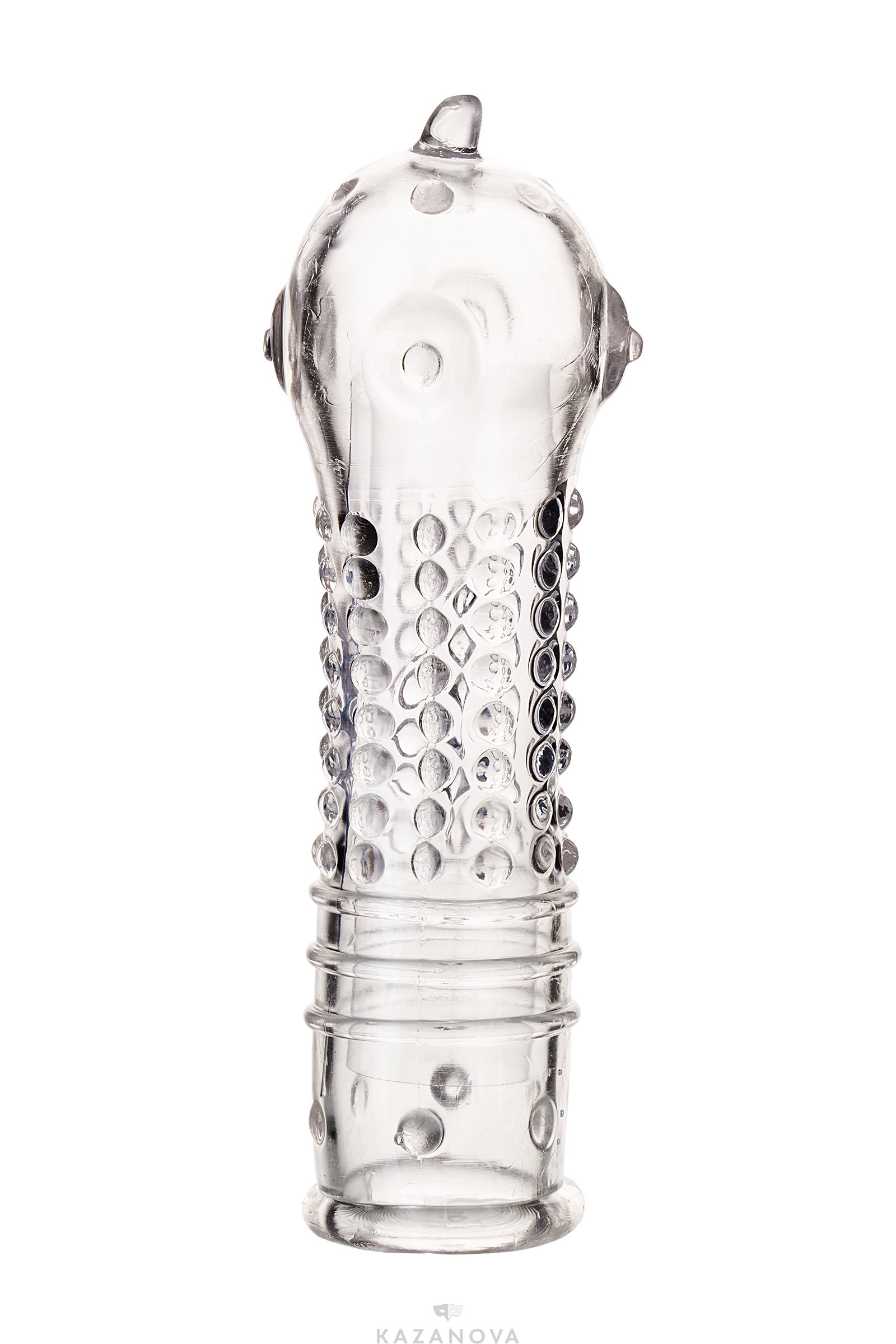 Прозрачная насадка надевается на эрегированный половой член и немного его сжимает. Изделие плотно обхватывает член и делает эрекцию более стойкой.