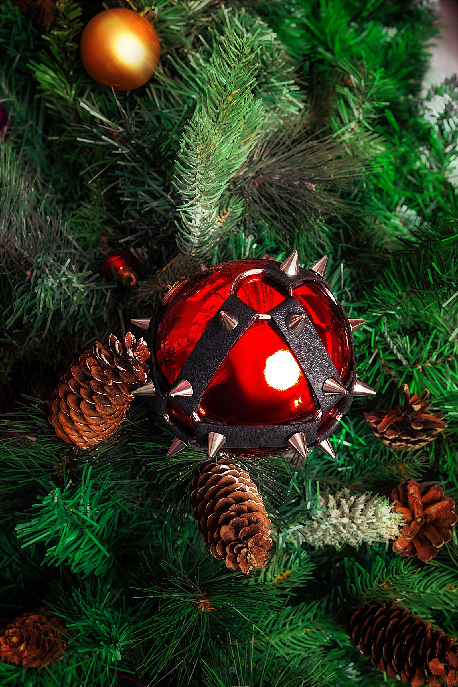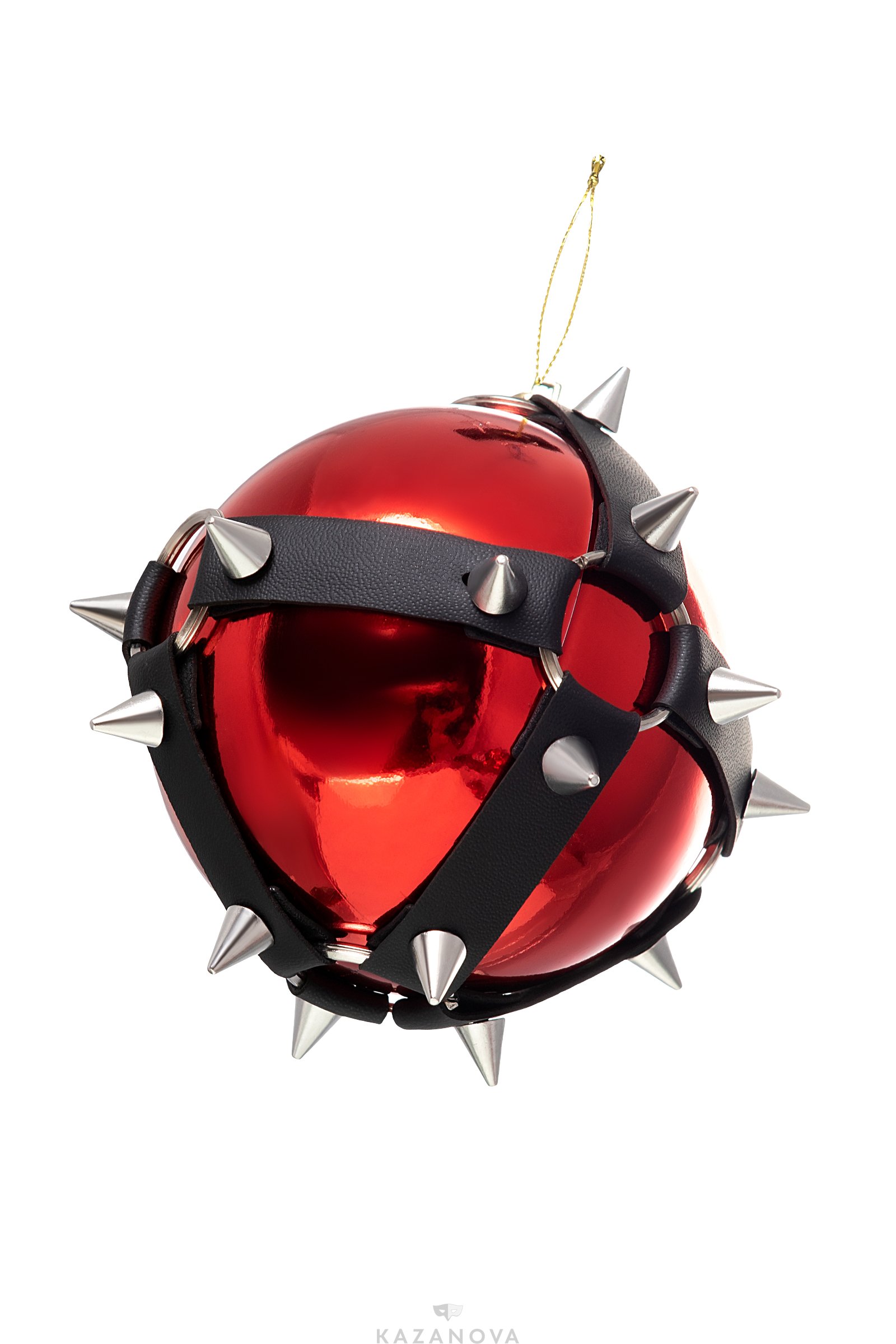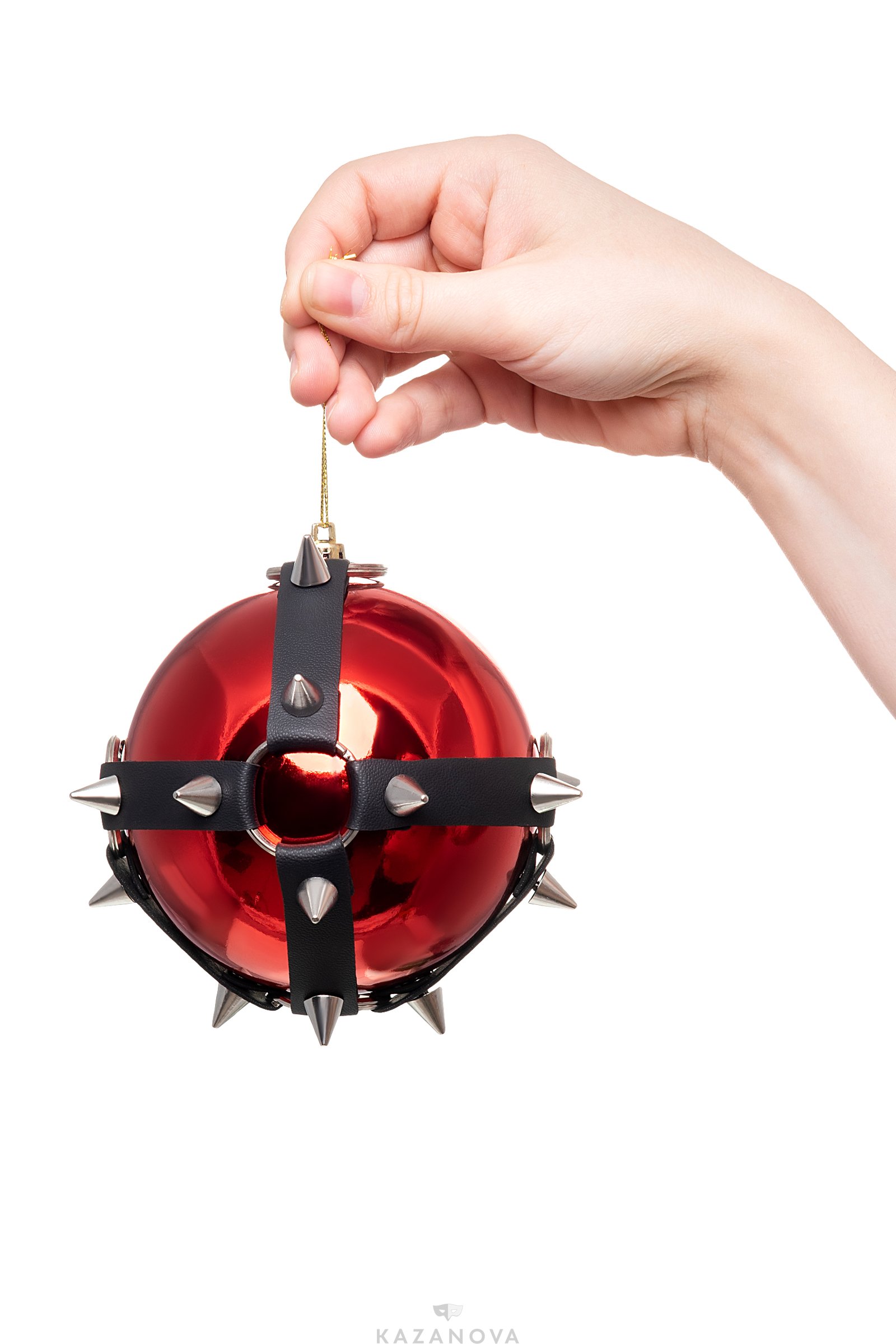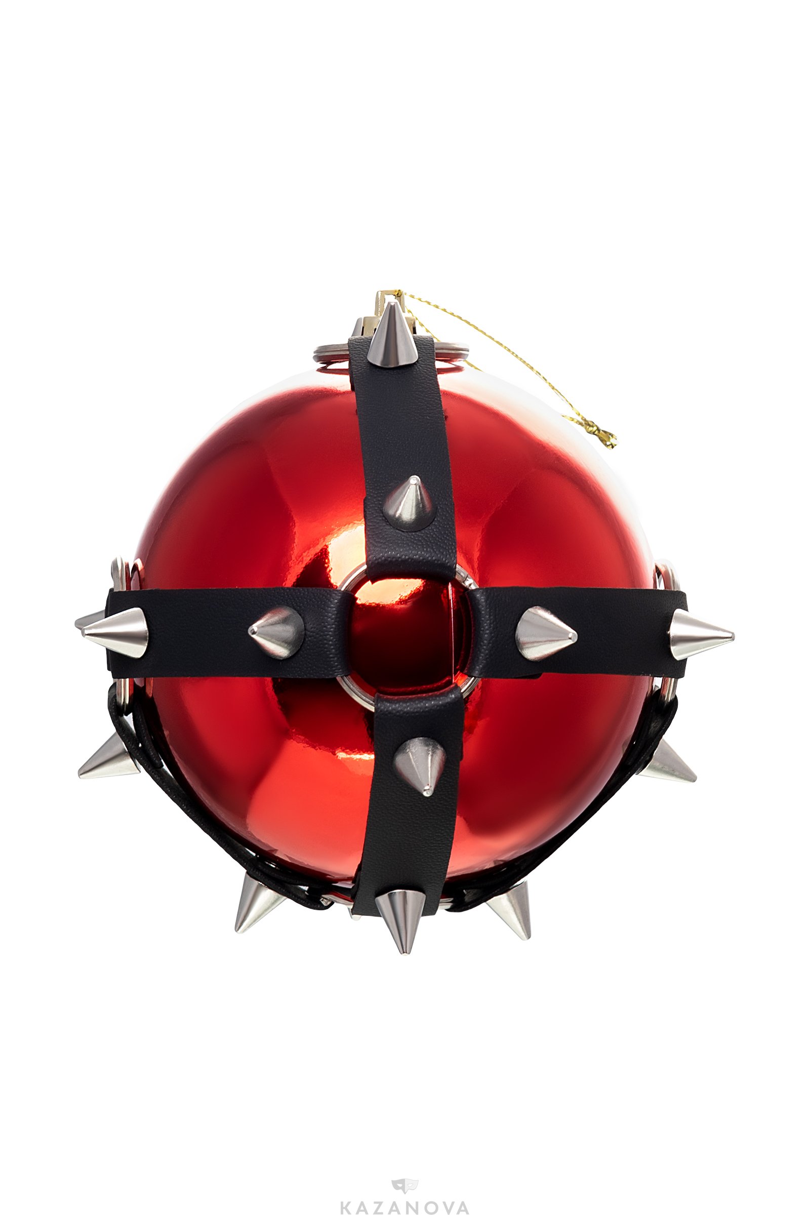 Шарик декорирован кожаной сбруей с шипами в стиле BDSM.