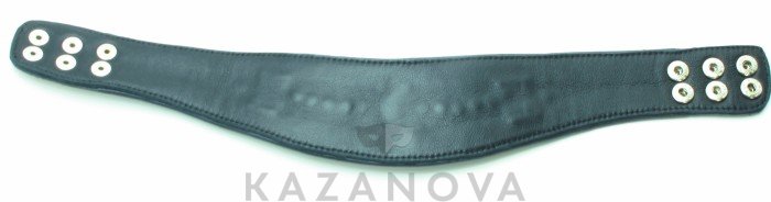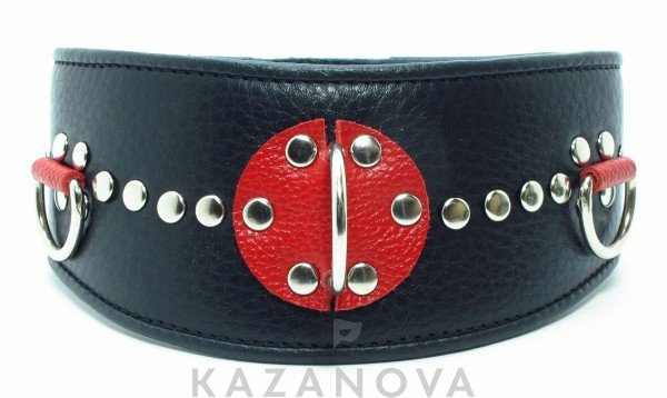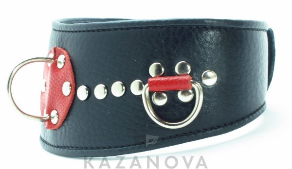 Ошейник с расширением впереди выполнен из качественной натуральной черной кожи, мягкий и комфортный в использовании. На изделии находятся три сварных полукольца. Аксессуар декорирован металлическими заклепками и вставками из красной кожи. Ошейник фиксируется металлическими кнопками, позволяющими подобрать нужный размер. Стильный аксессуар поможет воплотить эротические фантазии в реальность.