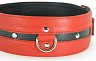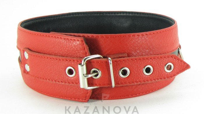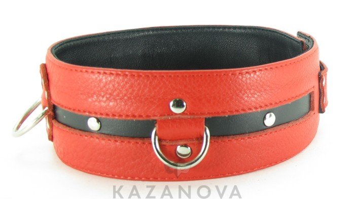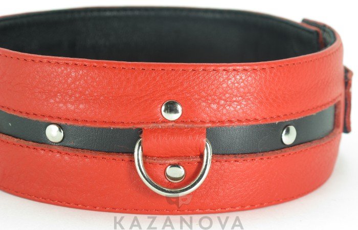 Ошейник выполнен из натуральной кожи красного цвета, декорирован вставкой из черной кожи, заклепками, тремя металлическими полукольцами. Ремень позволяют выбрать нужный размер, металлическая пряжка надежно фиксирует аксессуар, подклад из нежной кожи обеспечивает комфорт. Стильный аксессуар поможет воплотить эротические фантазии в реальность.