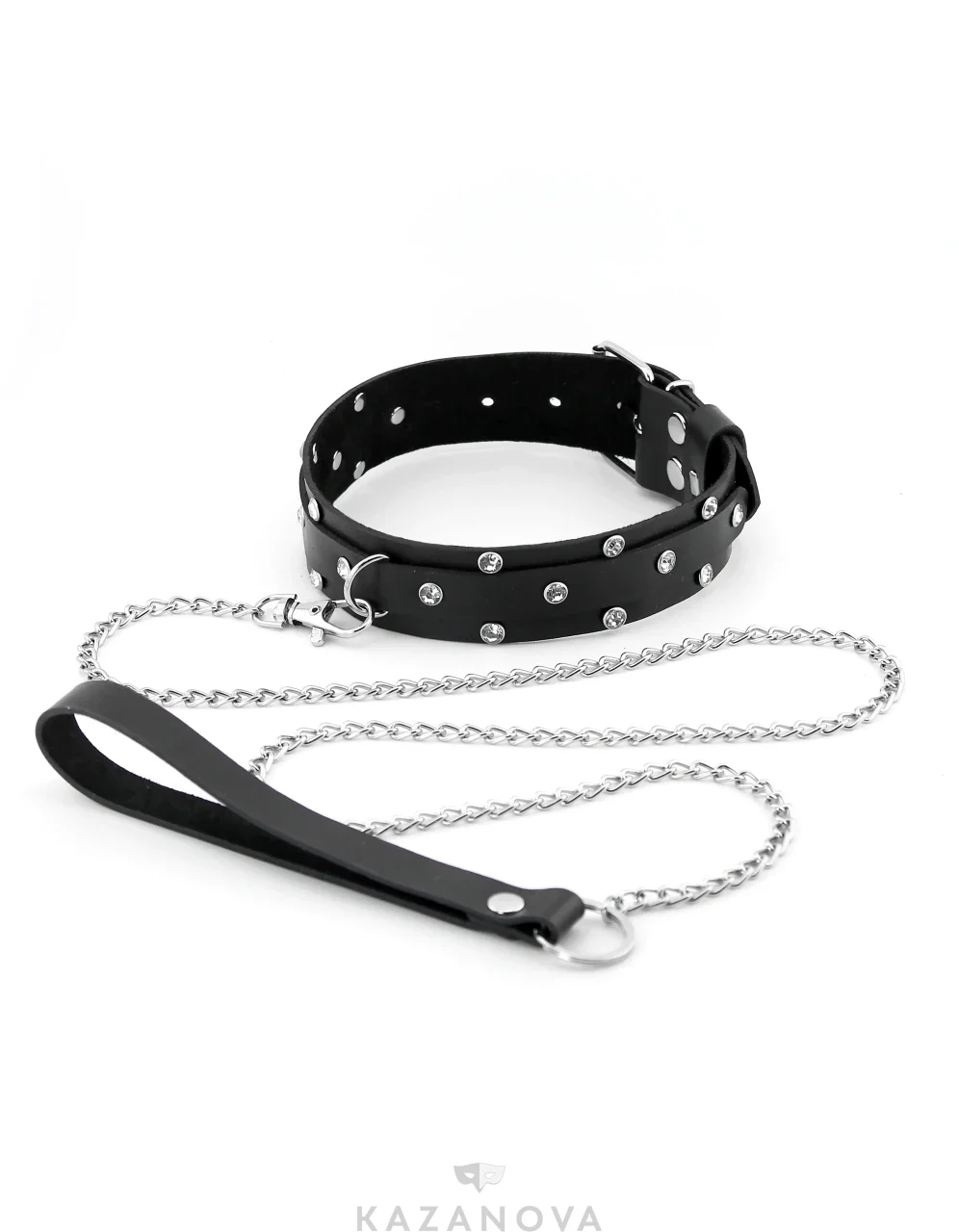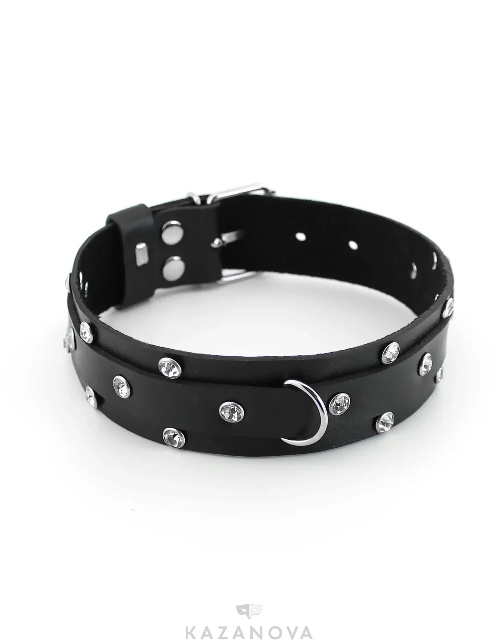 Аксессуар из натуральной кожи плотно облегает шею, но не сдавливает. Дополнен металлическими кольцом, стразами и поводком.