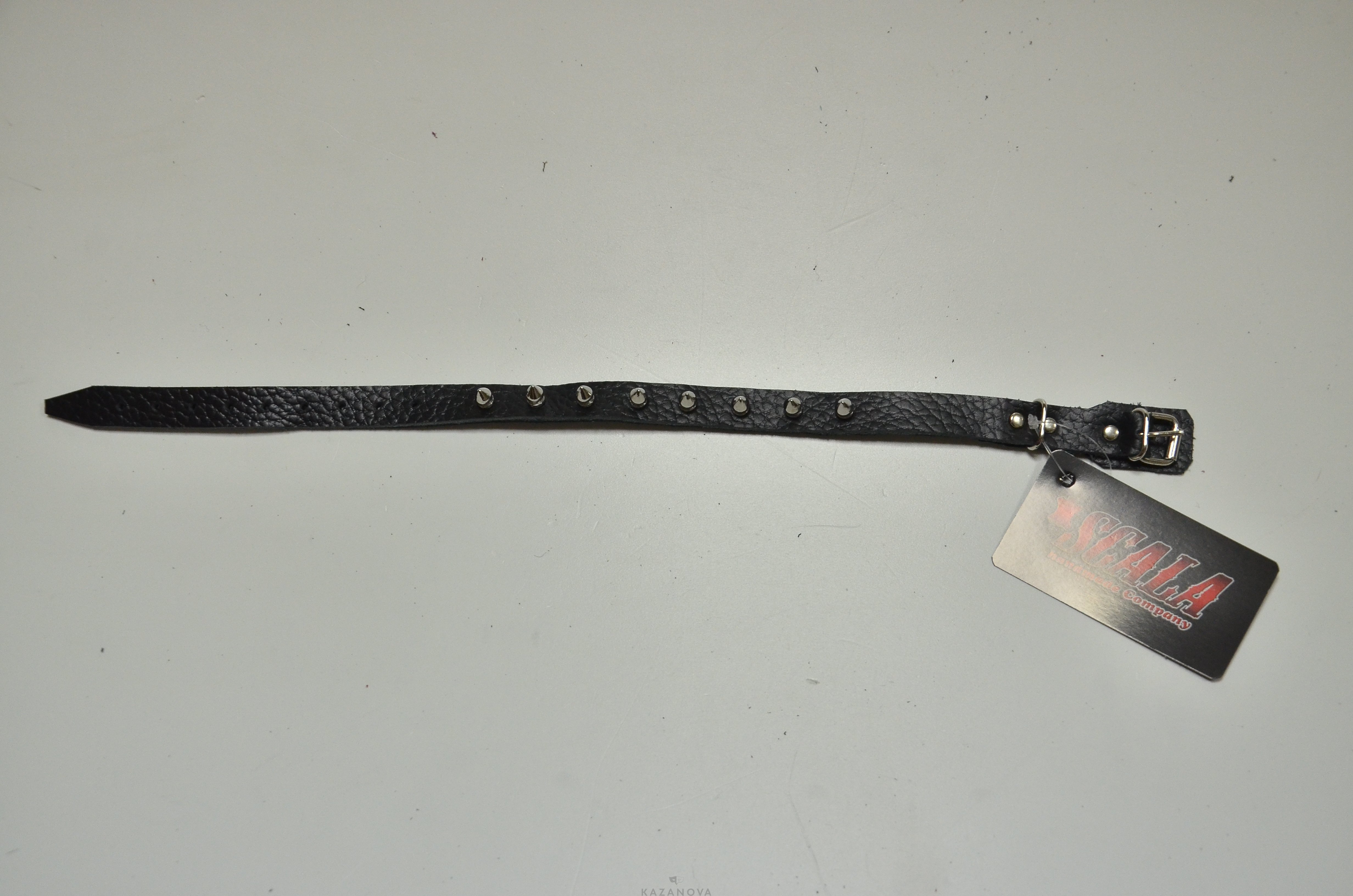 Ошейник изготовлен из натуральной кожи и декорирован шипами.