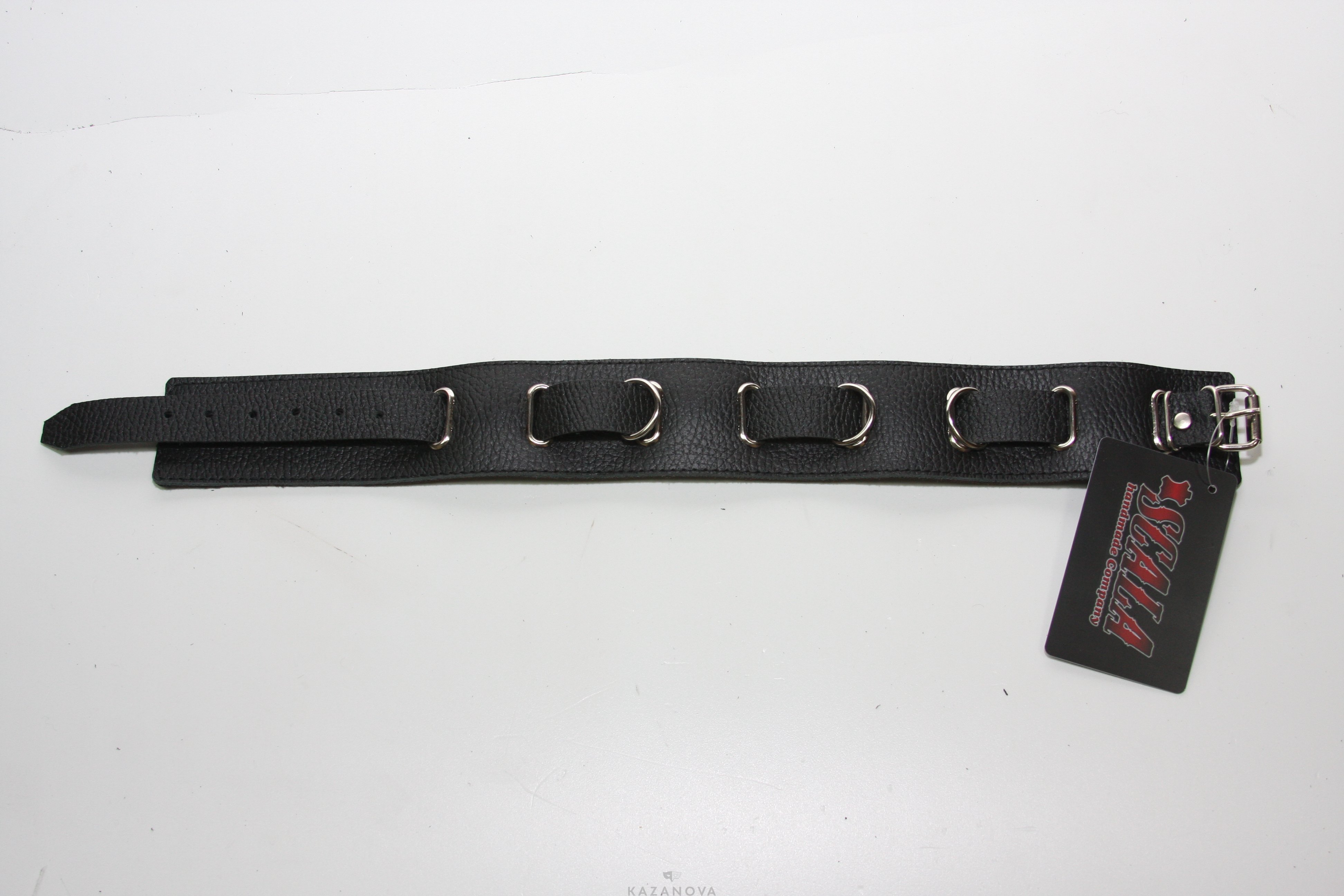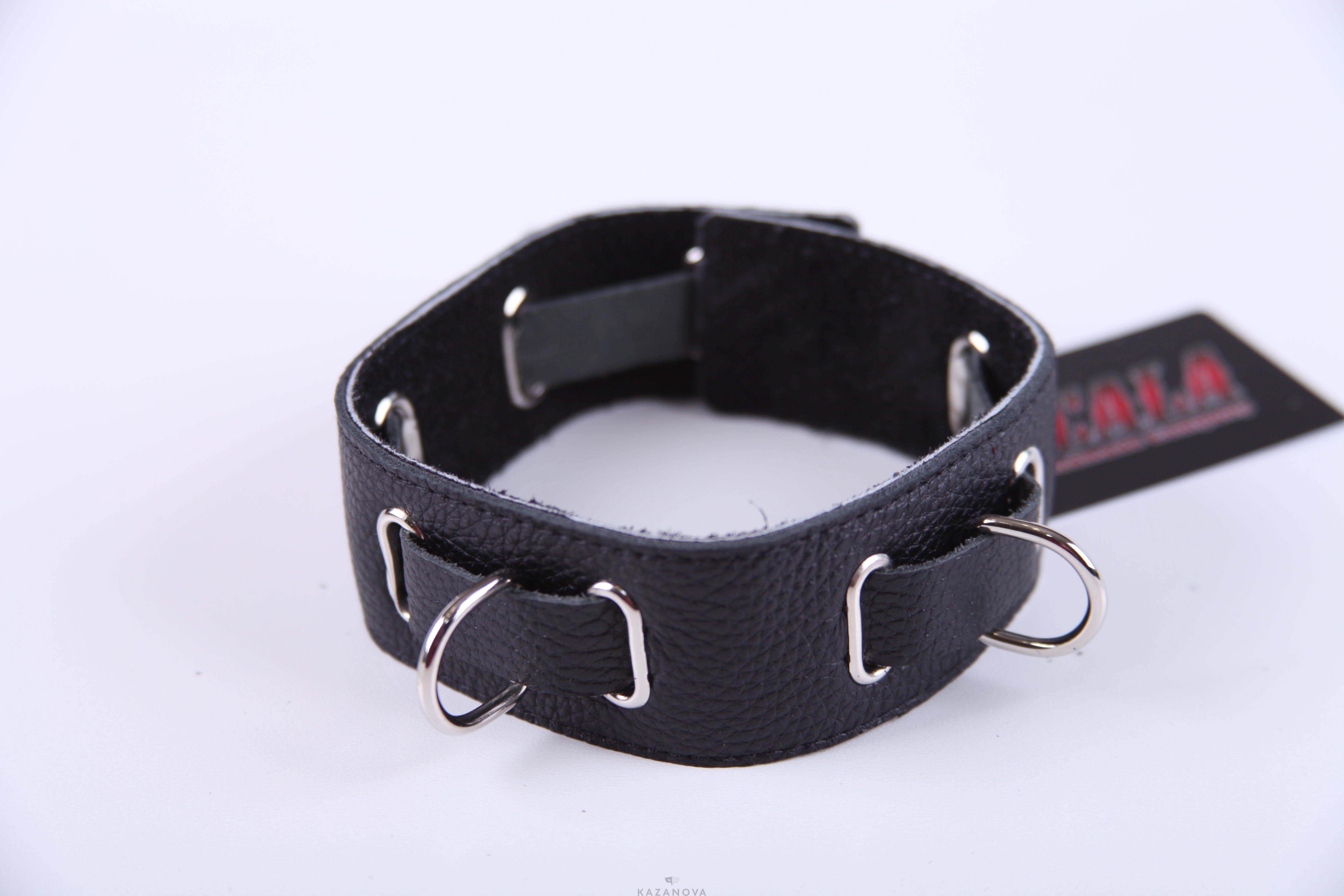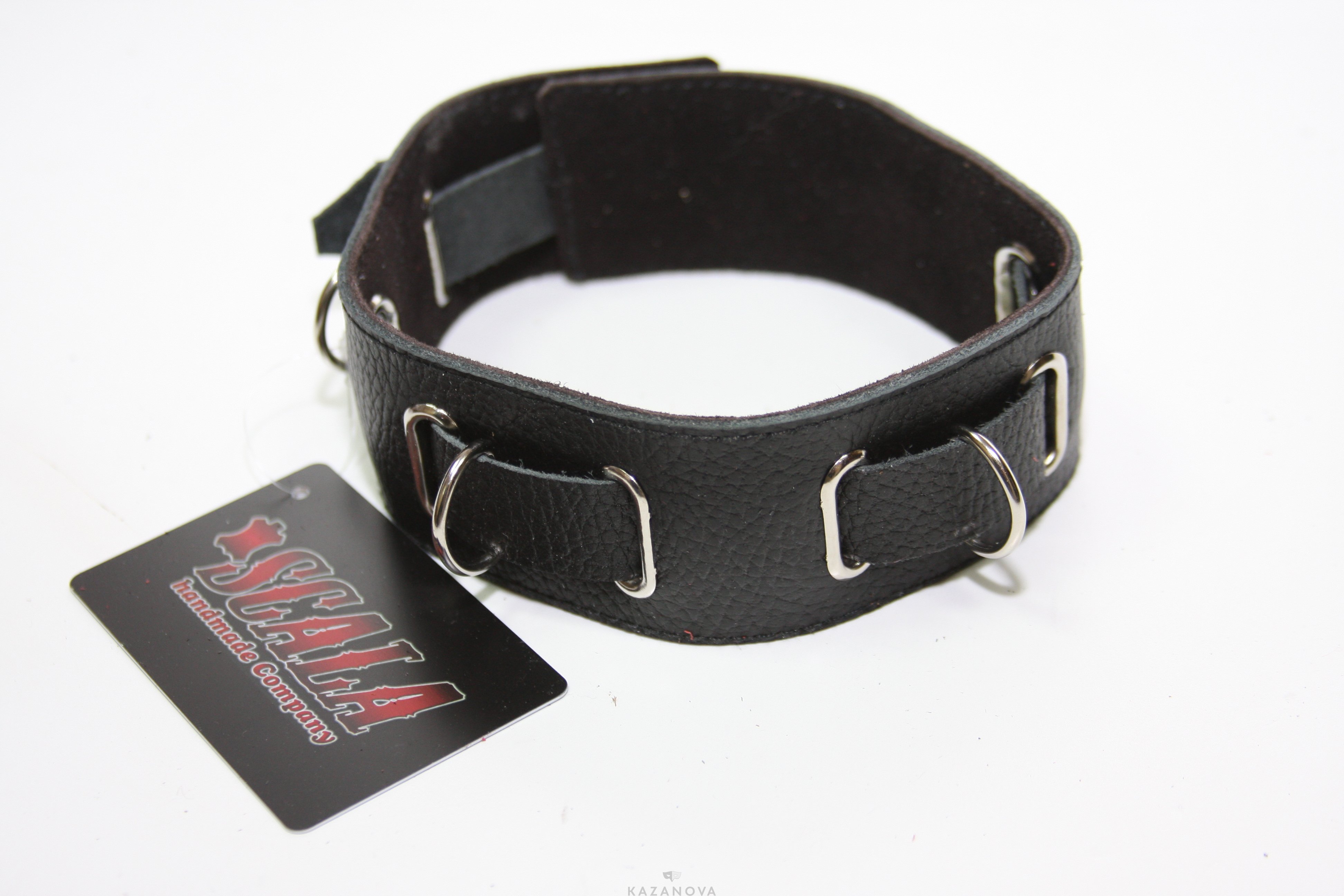 Строгий ошейник из коллекции Scala изготовлен из натуральной кожи превосходного качества, декорирован металлическими элементами и тремя кольцами.