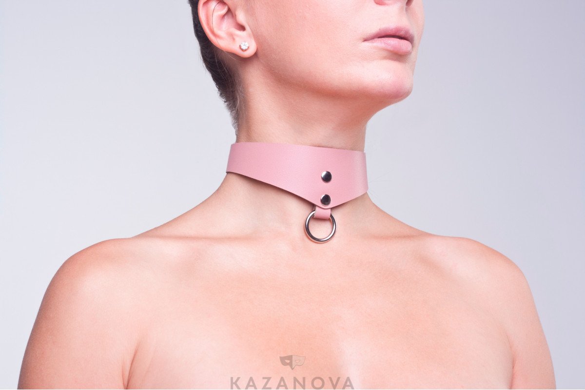 Ошейник изготовлен из натуральной кожи розового цвета и декорирован кольцом и заклепками из металла.