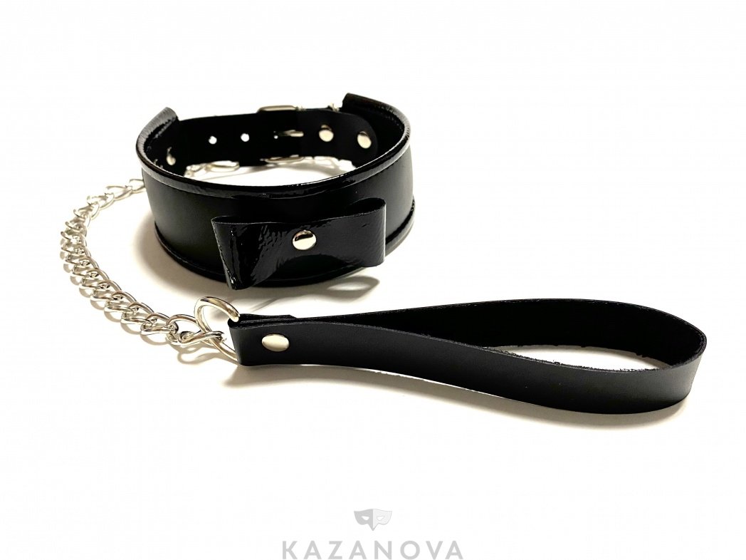 Ошейник декорирован бантиком спереди и металлическим полукольцом, к которому пристегивается поводок. Основная часть выполнена из матовой эко-кожи, а бант и вставки по краю - из лаковой, что придаёт ошейнику изящества. Общая длина ошейника вместе с пряжкой и ремешком 47см, ширина 4,5см. Общая длина поводка, включая карабин и петельку, 45см. Этот комплект поможет добавить разнообразия и стать волнующим элементом любовной игры.