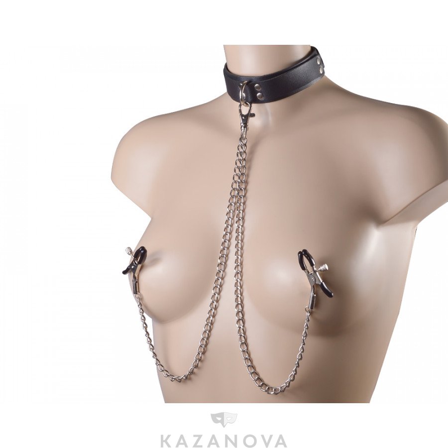 Используй ошейник как символ безграничной власти над партнером! Открой для себя новое удовольствие подчинения и доминирования. Кожаный ошейник бережно охватывает шею, обеспечивая полный комфорт во время использования. При помощи пряжки и ремешка ошейник легко регулируются по размеру. В комплект входят зажимы для сосков с силиконовыми накладками.