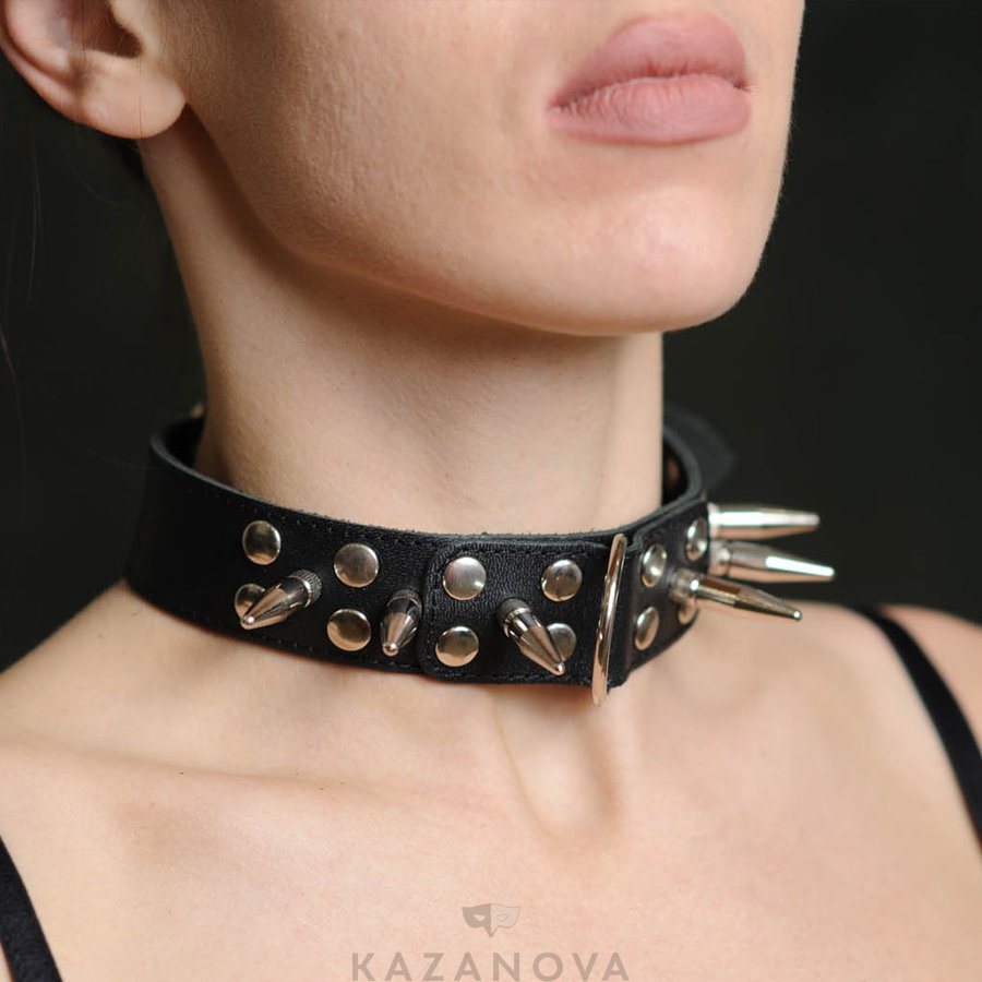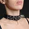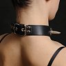 Ошейник изготовлен из натуральной кожи черного цвета и декорирован шипами из металла.