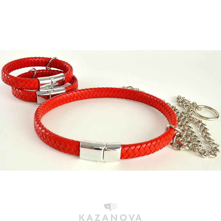 Ошейник состоит из плетеного винилового шнура шириной 11 мм и магнитных застежек. Общая длина наручника 35 см. К ошейнику прикреплен поводок длиной около 50 см.