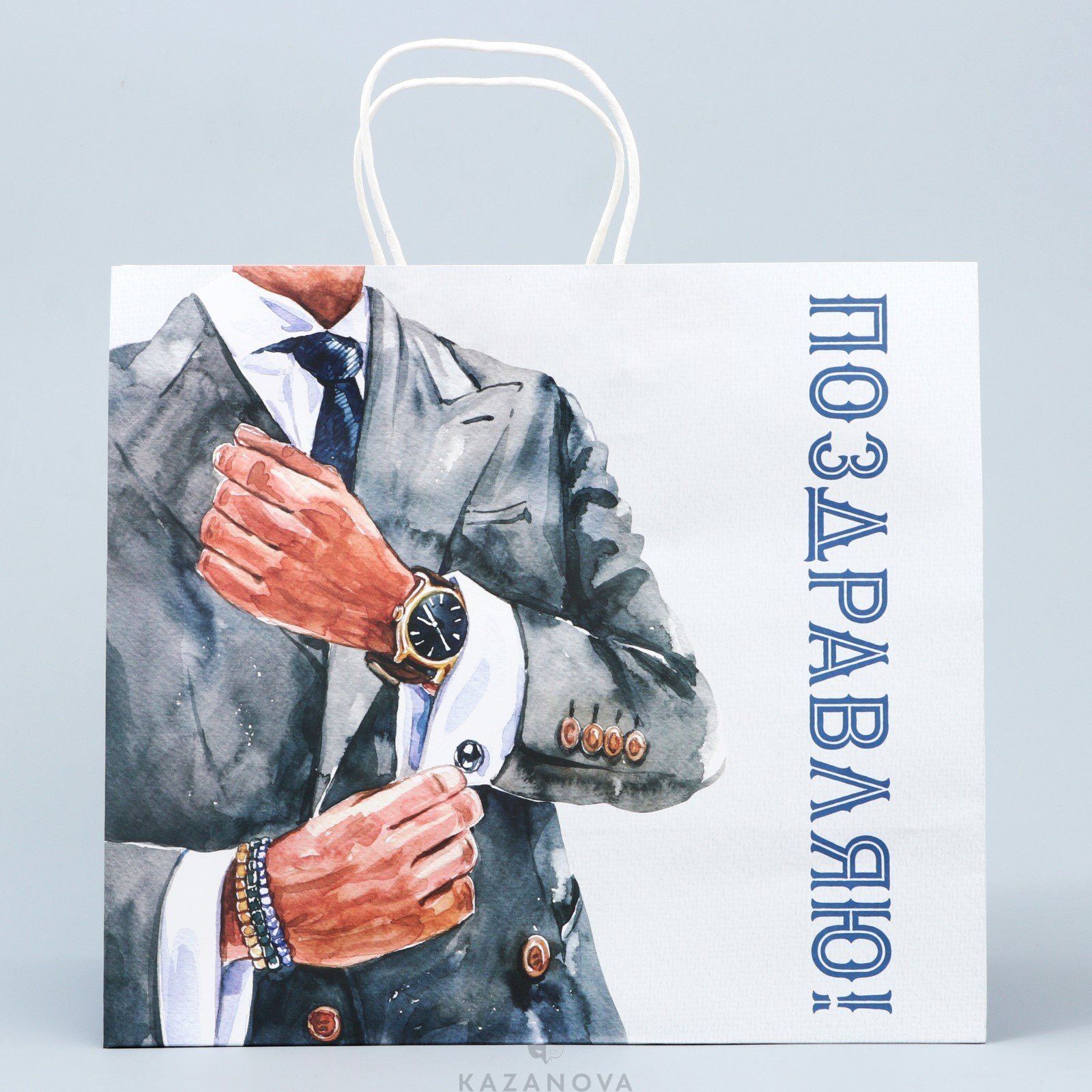 Подарочный пакет «Настоящему джентельмену» с принтом подчеркнет особенные чувства дарителя.