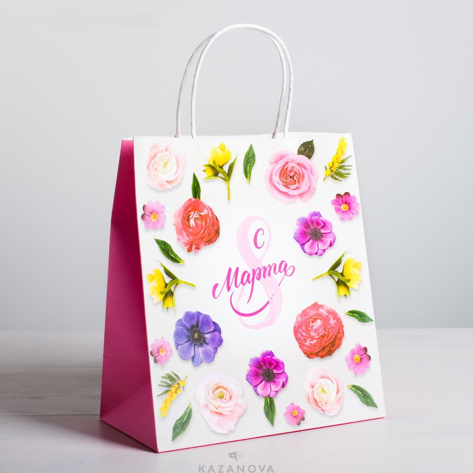 Подарочный пакет «С 8 Марта» с принтом подчеркнет особенные чувства дарителя.