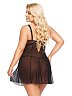 Пеньюар сделан из полупрозрачной ткани. Выделенная зона декольте привлекает внимание к груди. В комплект входят стринги.