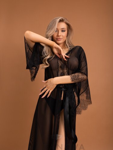 Этот наряд сделан из прозрачной сетки, что позволяет обнажить красивое женское тело, но в то же время не показывая его полностью. При этом, потрясающее тонкое французское кружево с ресничками, отделка края и низа, придают пеньюару особый шарм и изысканность. К тому же, благодаря расклешенным рукавам, этот пеньюар создает эффект легкости и плавности, а также подчеркивает тонкость и элегантность женских рук. В нем ты будешь чувствовать себя уверенно и привлекательно, не снимая наряд даже во время близости.