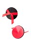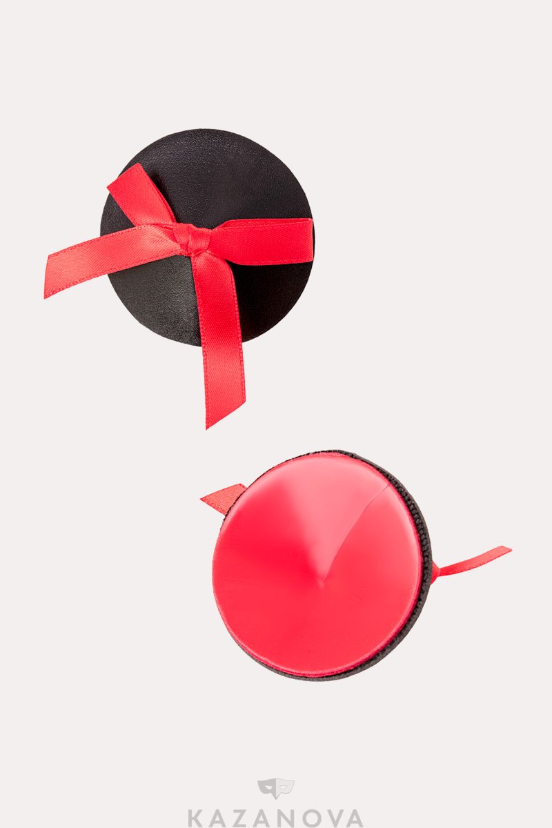 Черные наклейки из искусственной кожи, украшенные красными сатиновыми бантиками, создадут игривое настроение как вам, так и вашему партнеру.