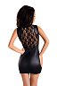 Глянцевая поверхность ткани удлиняет силуэт и скрывает недостатки фигуры. Кружевные вставки в районе декольте и спины смягчают вызывающе сексуальный образ, созданный благодаря обтягивающему материалу. В комплекте идут стринги.