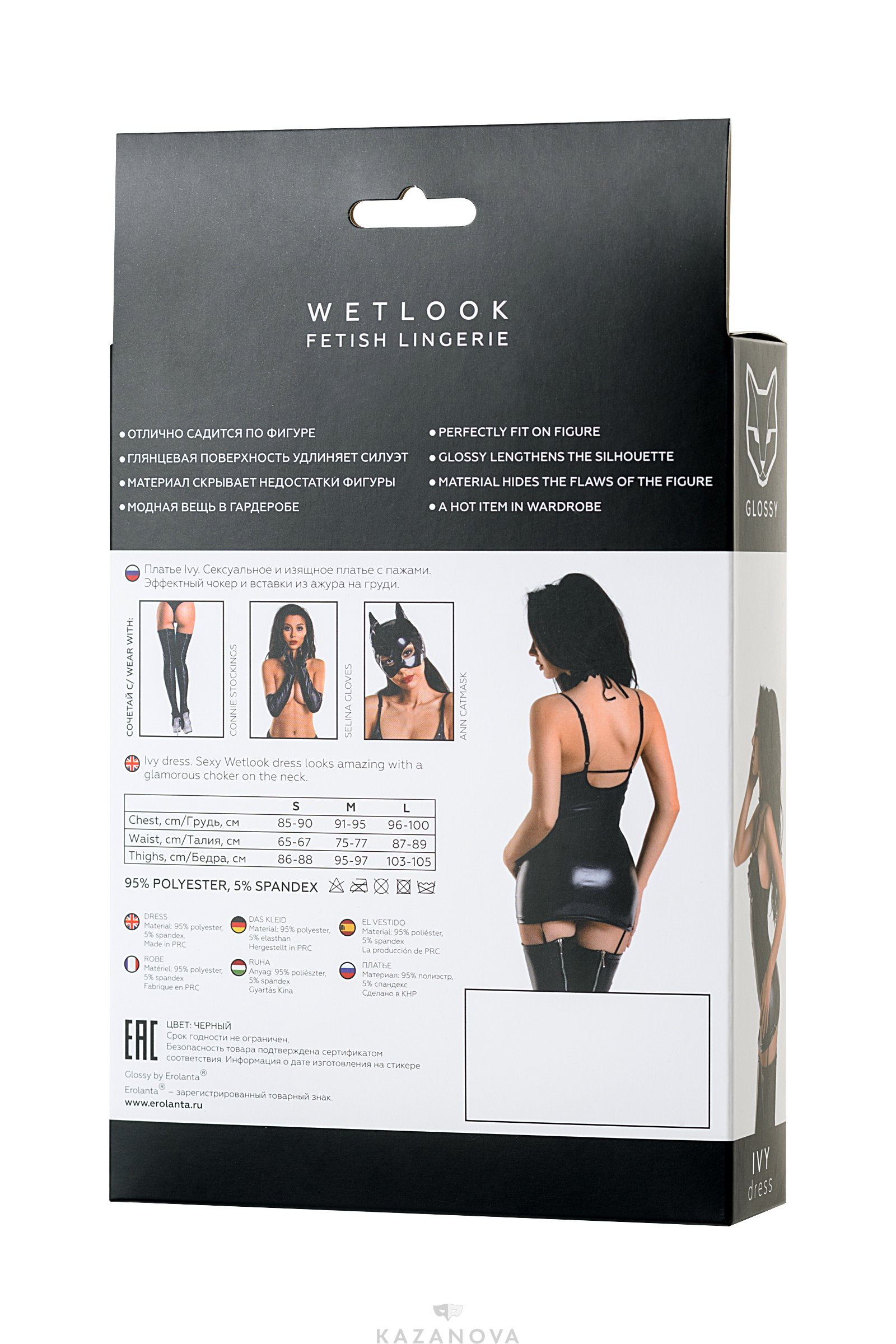 Черное платье сделано из плотной ткани с виниловым блеском.