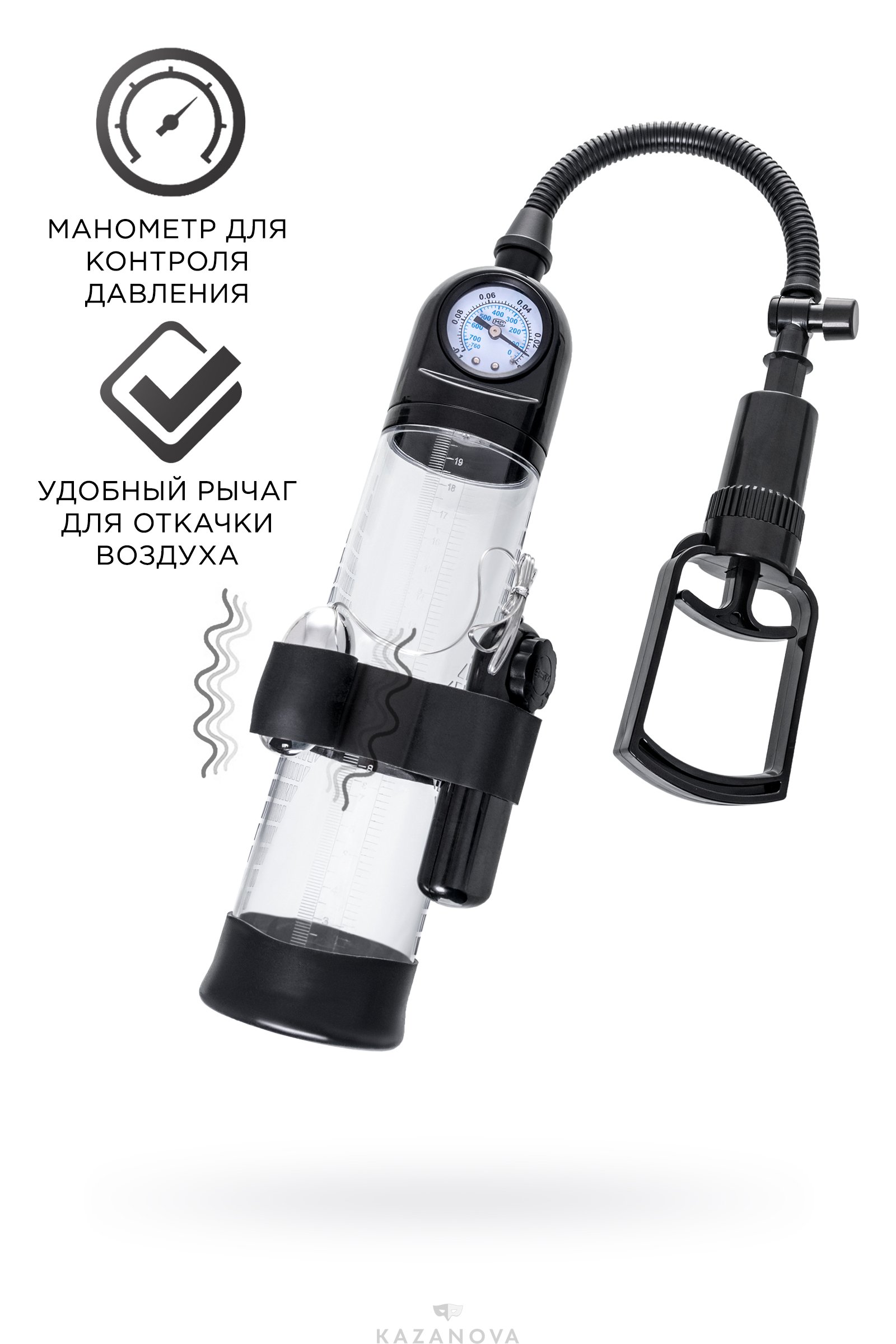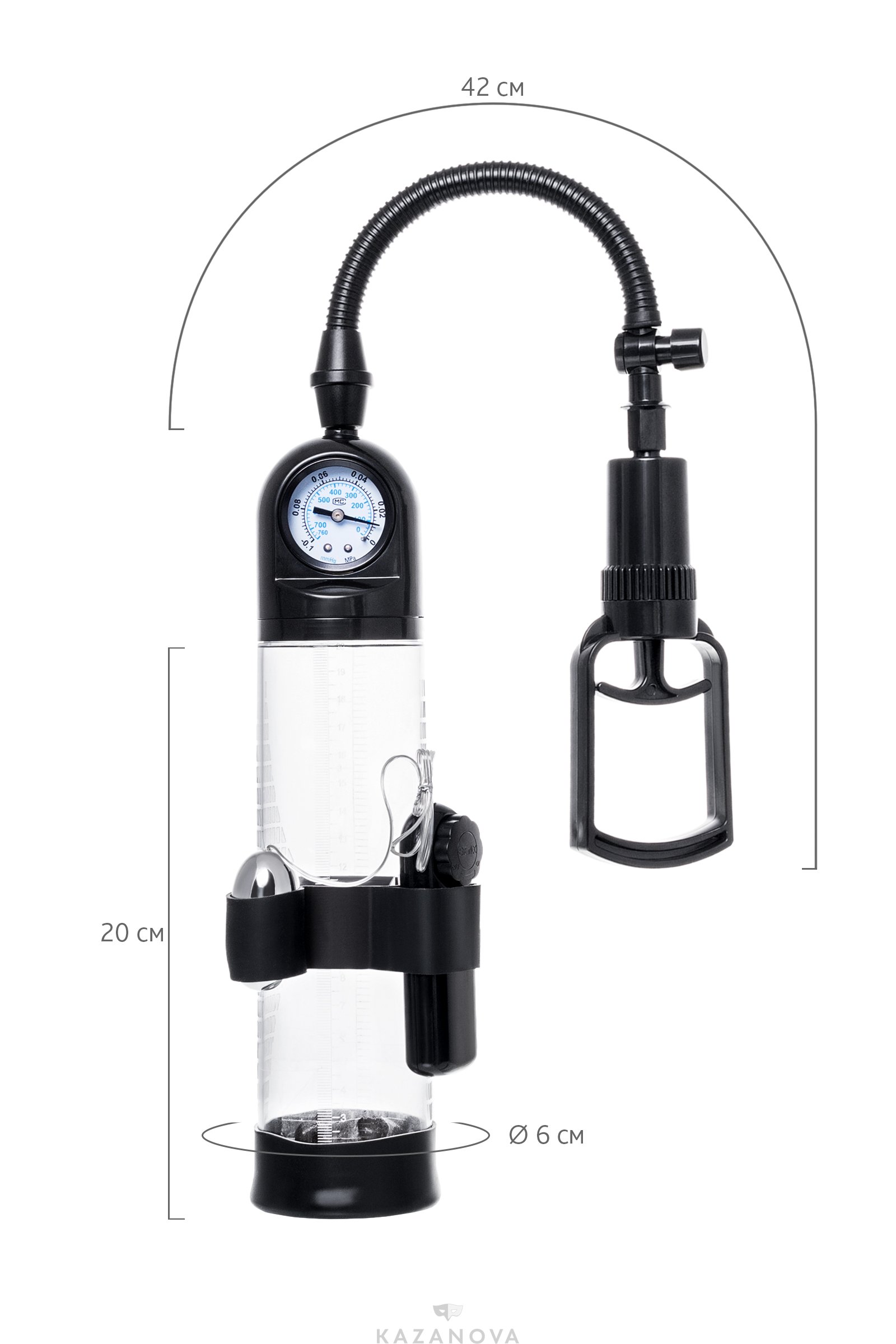Для тренировки, а также чтобы подготовить себя к длительному и яркому сексу, вставь свой пенис в колбу и откачай воздух с помощью рычага. Благодаря отрицательному давлению увеличивается приток крови к половому члену, за уровнем давления удобно следить с помощью встроенного манометра. Прозрачный ABS-пластик позволяет наблюдать как пенис набирает силу и увеличивается в размере. А измерительная шкала позволит отслеживать результаты прямо в процессе. Для достижения ощутимых результатов рекомендуются систематические занятия по программе эффективного тренинга, которая входит в комплект.