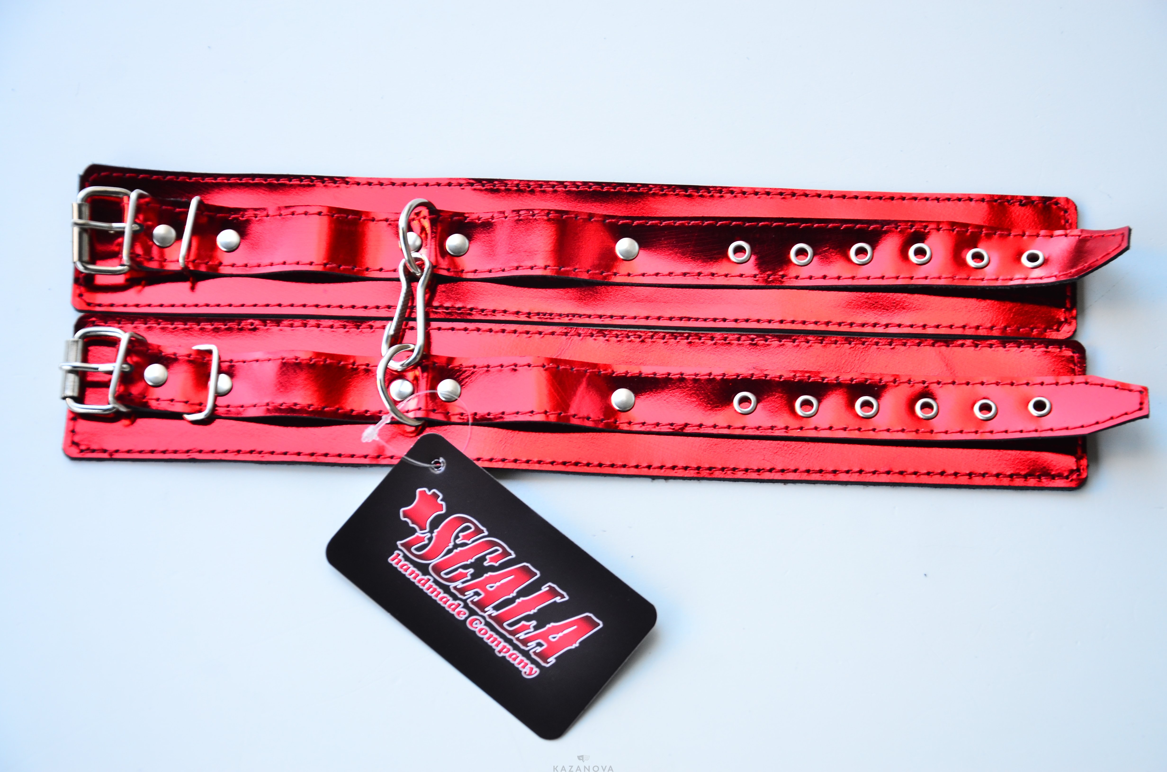 Поножи из коллекции бренда Scala изготовлены из натуральной лакированной кожи превосходного качества и декорированы металлическими элементами.