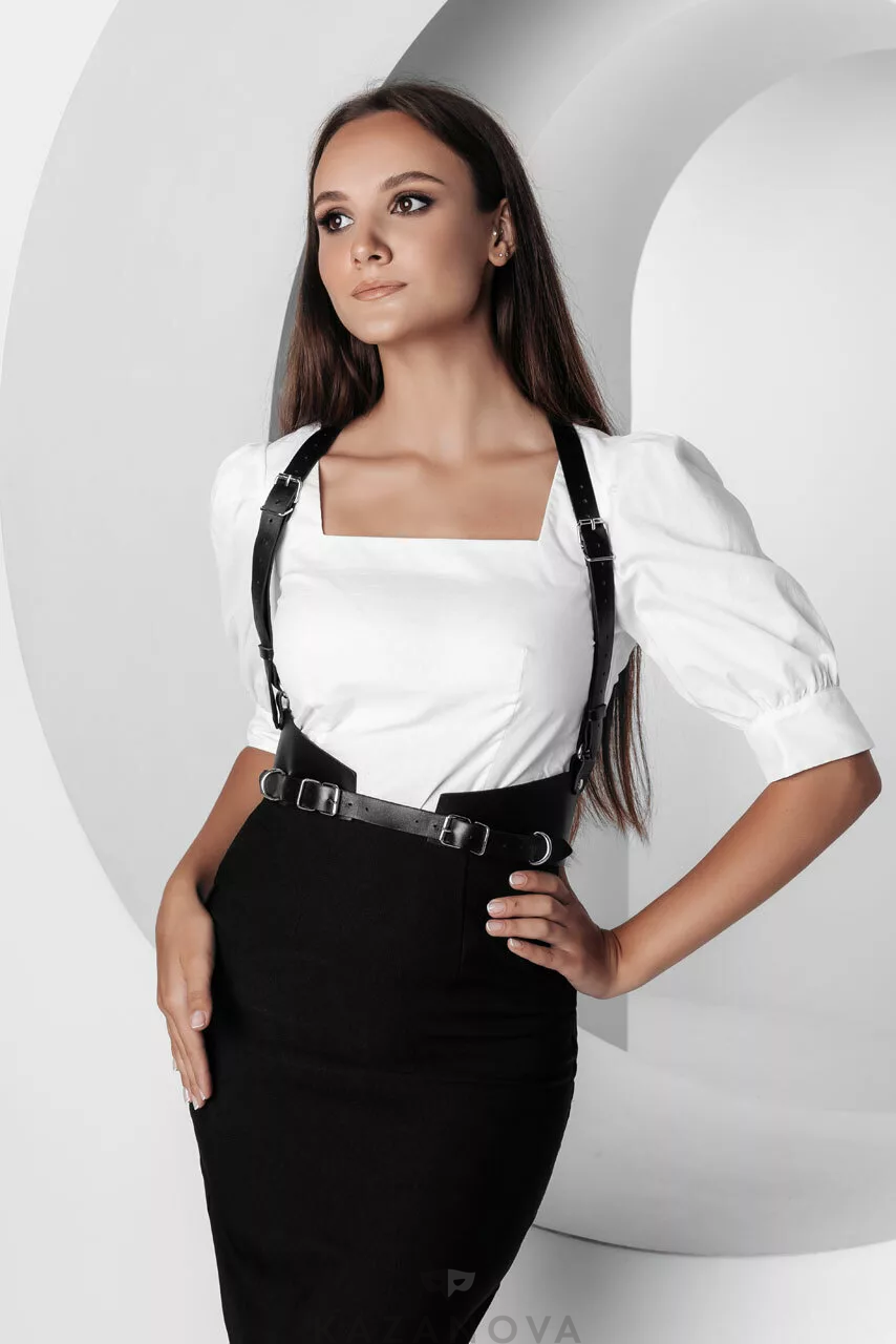 Портупея отлично сочетается с однотонной одеждой и белыми рубашками. Аксессуар можно надеть и на обнаженное тело, если это предполагает сценарий ролевой игры или BDSM-сессии.