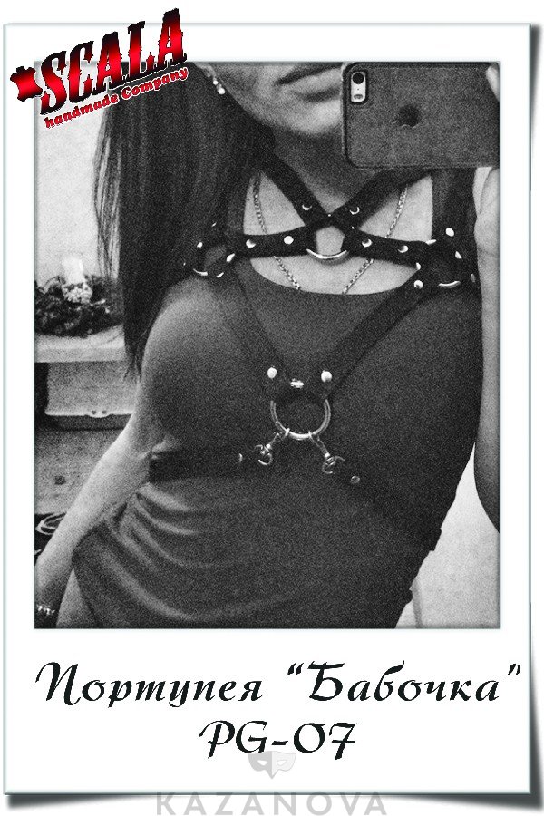Портупея «Бабочка» из коллекции Scala изготовлена из натуральной кожи превосходного качества, декорирована металлическими элементами, кольцами и мягкой подкладкой для более комфортного ношения.