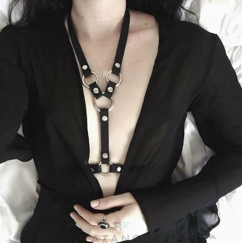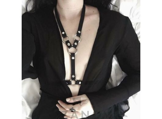 Портупея изготовлена из натуральной кожи превосходного качества, декорирована металлическими элементами, кольцами и мягкой подкладкой для более комфортного ношения.