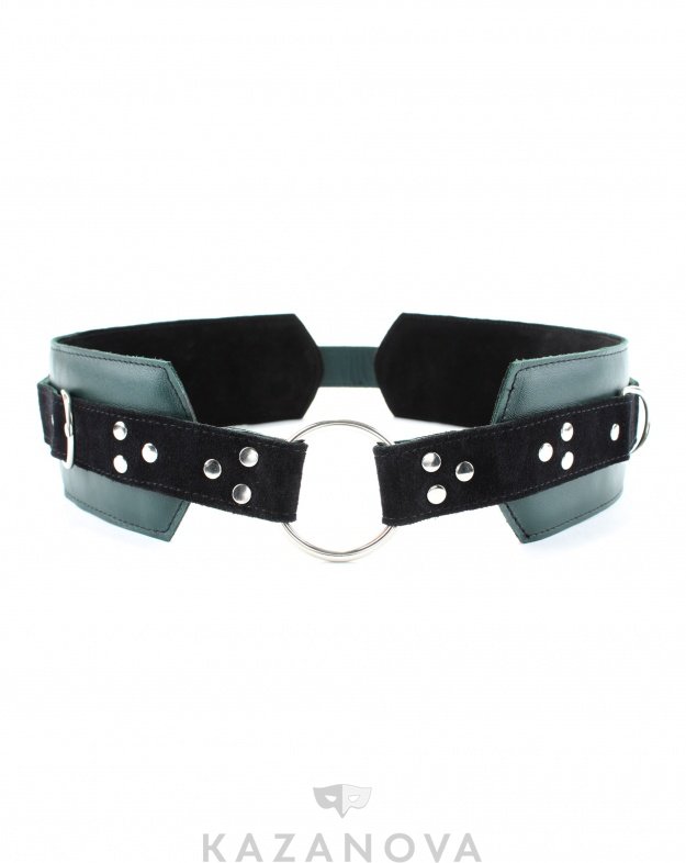 Пояс изготовлен из натуральной кожи изумрудного цвета и декорирован металлическими кольцами и заклепками.