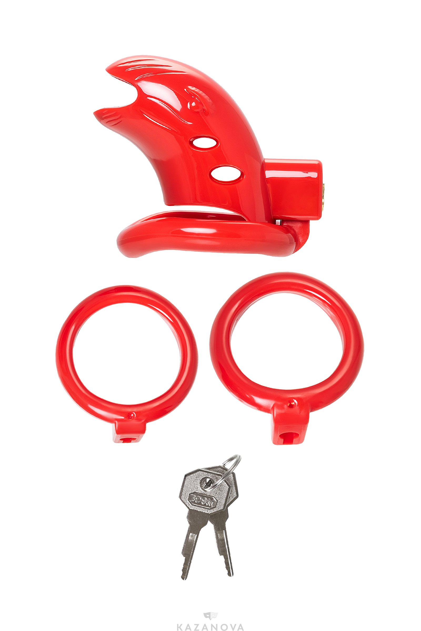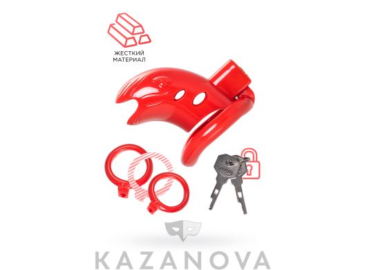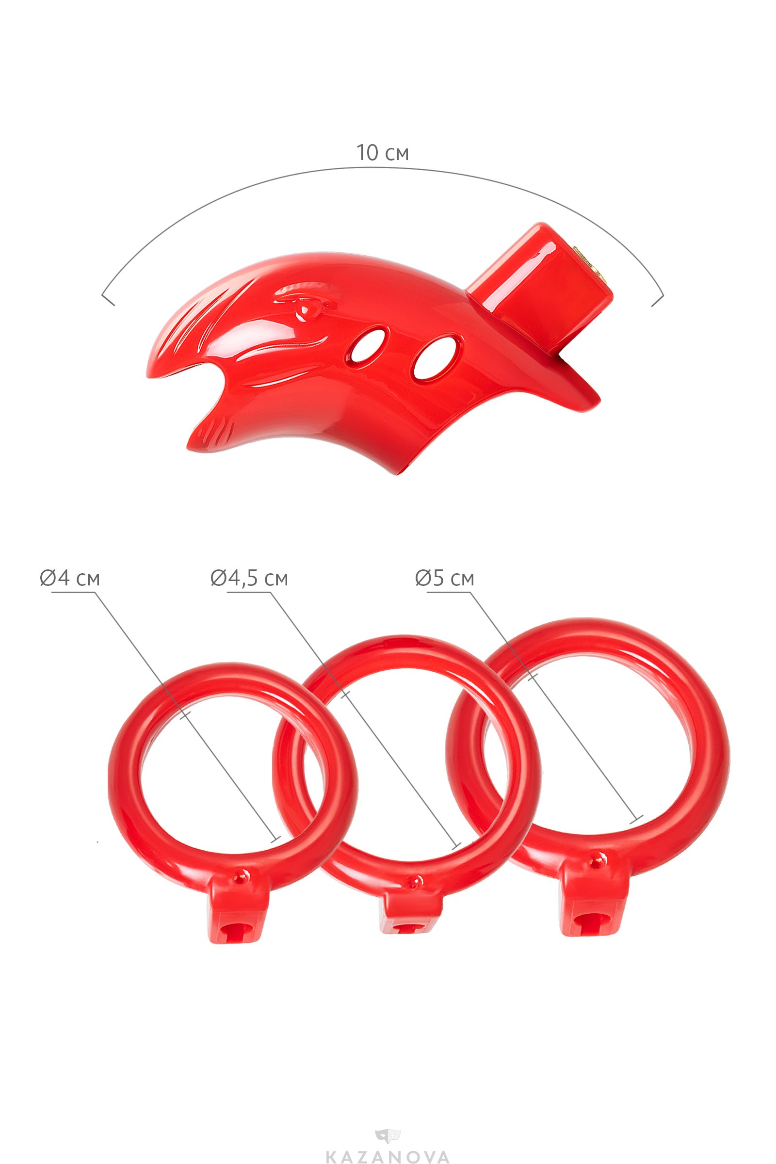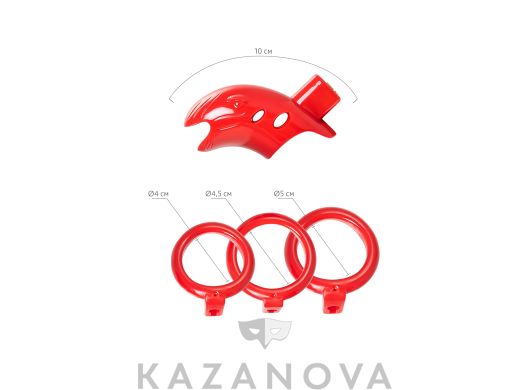 Отверстие на конце делает возможным мочеиспускание, поэтому пояс подходит для длительного ношения. В комплекте три пластиковых кольца разного диаметра, подходящих для разных размеров пенисов и вариантов ношения.