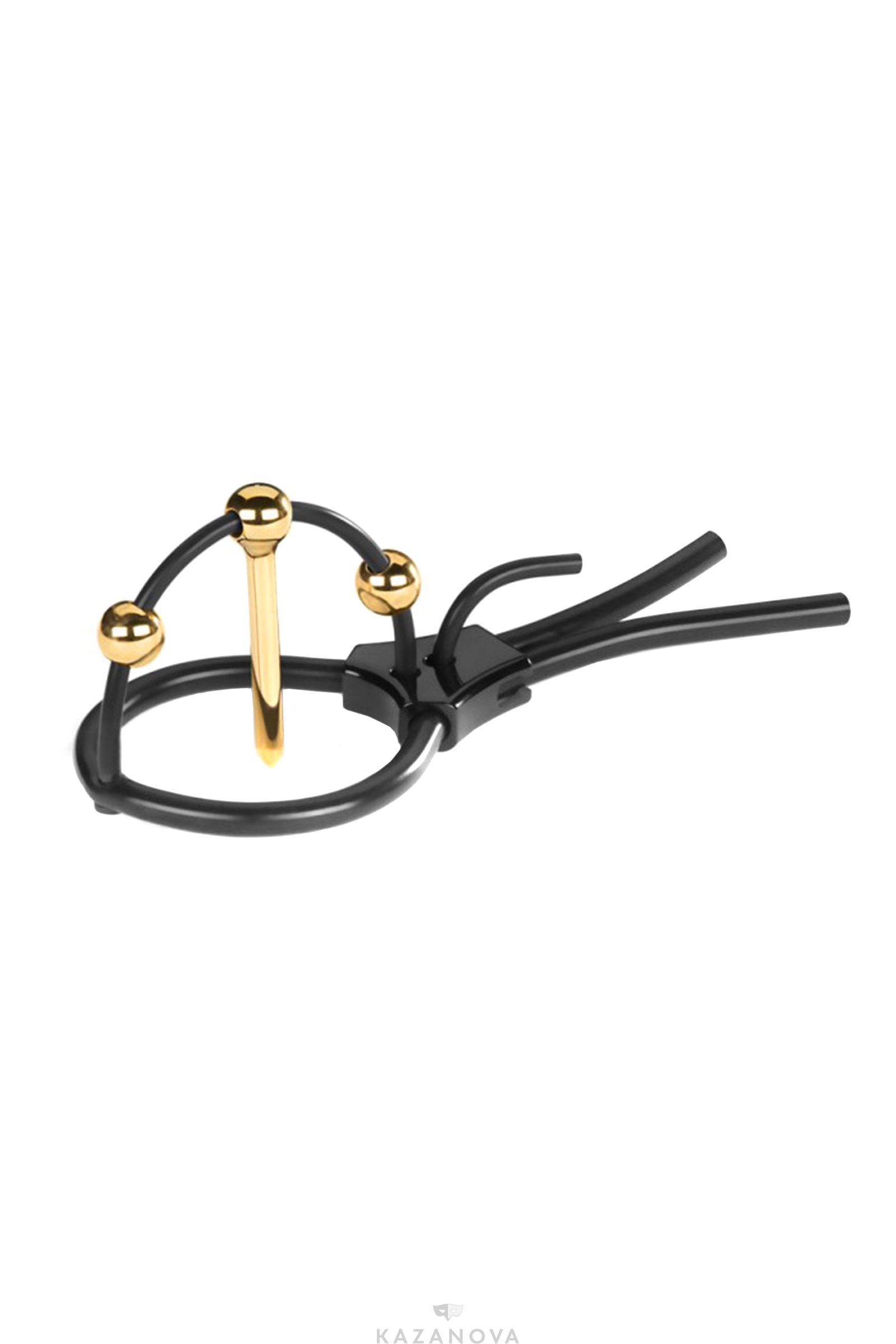 Mystim Plunging Pete — электросбруя, украшенная двумя позолоченными бусинами и расширителем уретры для интенсивной внешней и внутренней стимуляции члена. Диаметр расширителя всего 4 мм, а длина 35 мм - уретральный плаг подходит для новичков.