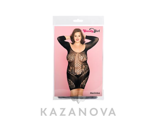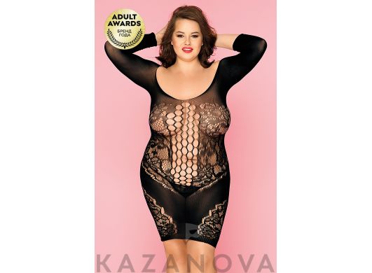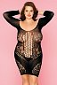 Короткое платье с круглым вырезом и длинными рукавами плотно облегает тело, подчеркивает грудь, талию и бедра, зрительно удлиняет ноги. В комплект входят стринги.