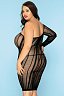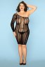 Черное платье изготовлено из эластичной ткани в сетку с рисунком.