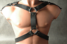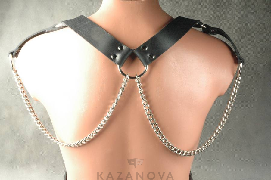 Впереди перекрестные ремни образуют букву «Y», на спине цепи образуют перекрестное соединение кожаных полос и цепей.
