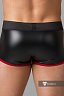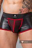 Черные шорты с красным декором изготовлены из текстиля с возбуждающим виниловым блеском.