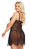 Сорочка изготовлена из полупрозрачной ткани с кружевной отделкой. Сорочка выделяет и поддерживает грудь. В комплект входят стринги.