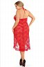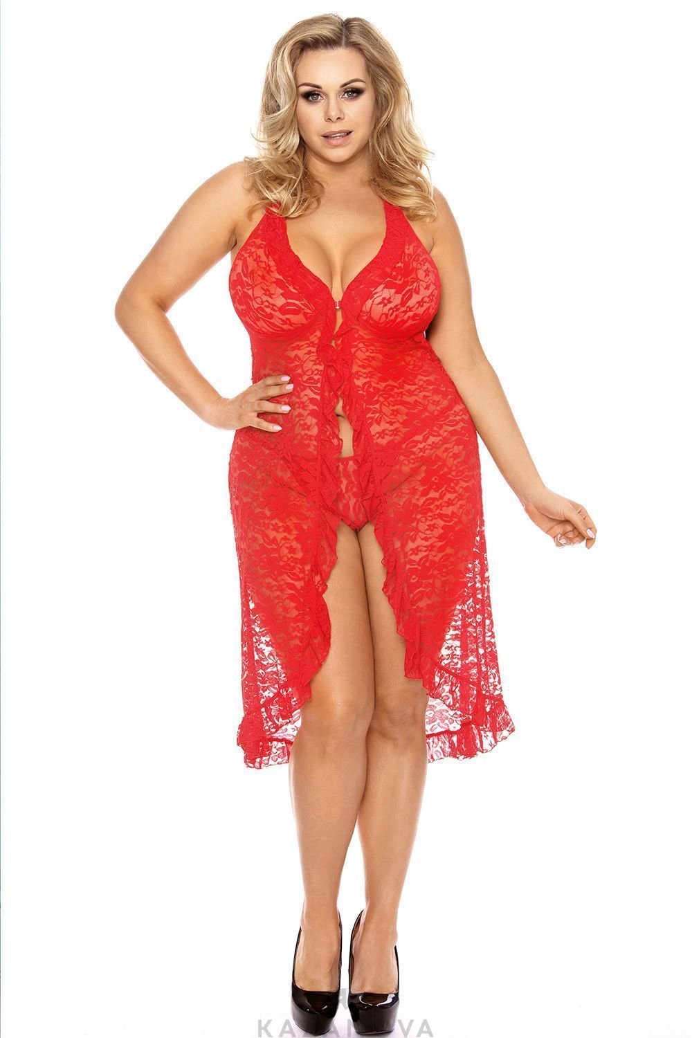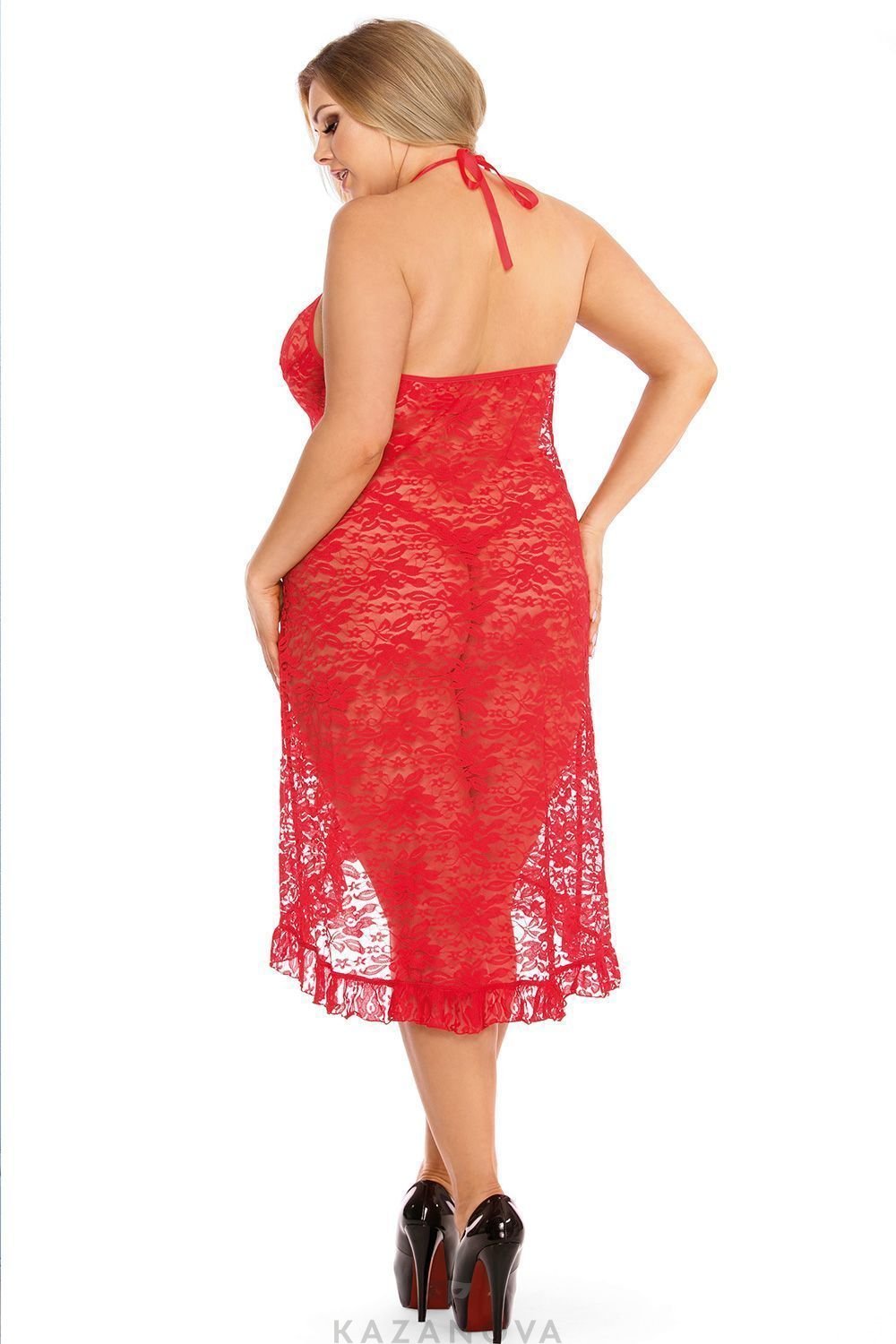Сорочка сделана из кружевной ткани. Сорочка фиксируется на шее завязками и оставляет открытой спину. Кружевной вырез привлекает внимание к груди. В комплект входят красные стринги.