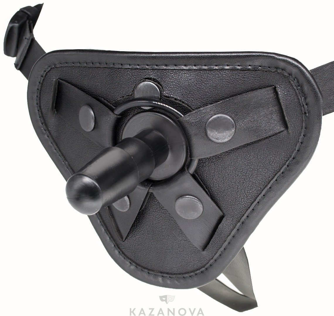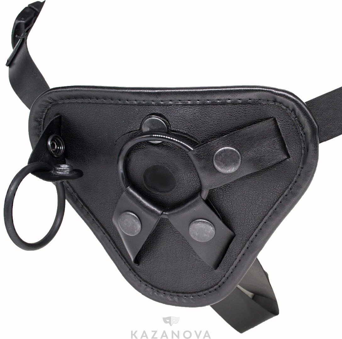 Пояс с регулируемыми креплениями подходит для любой комплекции, сделан из искусственной кожи. В комплект входят две насадки: реалистичная в виде полового члена из кибекожи и более тонкая для анальной стимуляции.