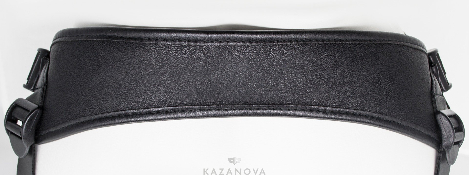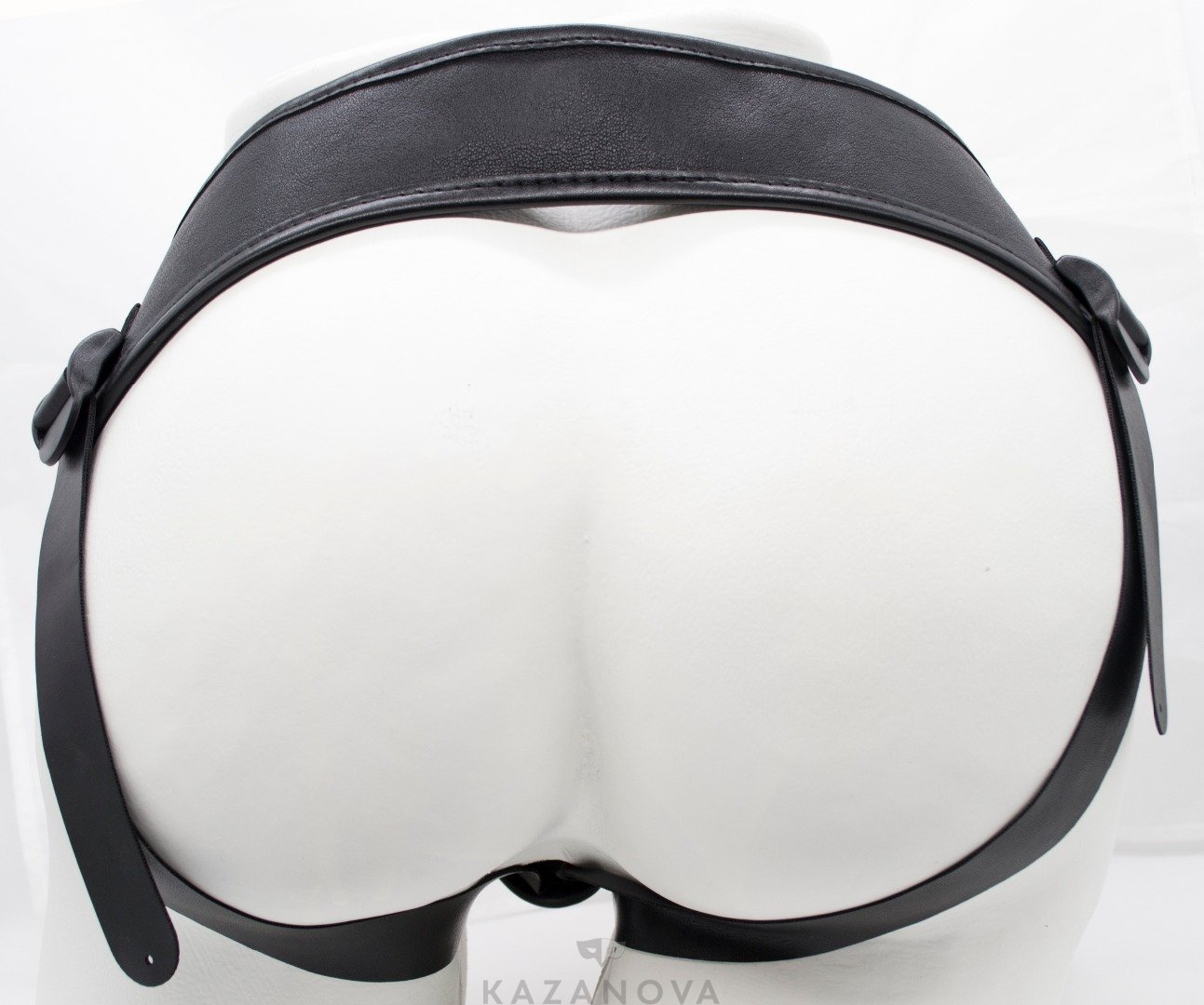 Пояс с регулируемыми креплениями подходит для любой комплекции, сделан из искусственной кожи. В комплект входят две насадки: реалистичная в виде полового члена из кибекожи и рельефная для анальной стимуляции.