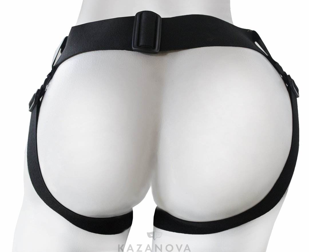 Пояс с регулируемыми креплениями подходит для любой комплекции, сделан из искусственной кожи. В комплект входят реалистичная насадка из киберкожи и жемчужный пояс для стимуляции клитора активной стороны.