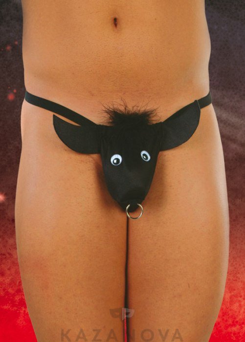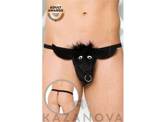 Необычные стринги в виде быка отлично подойдут для особенного свидания. Объемная аппликация ушей, челки, глаз и носа с кольцом произведет неизгладимое впечатление даже на опытную любовницу. Эластичные тесемки надежно удерживают стринги и не сдавливают при этом тело.