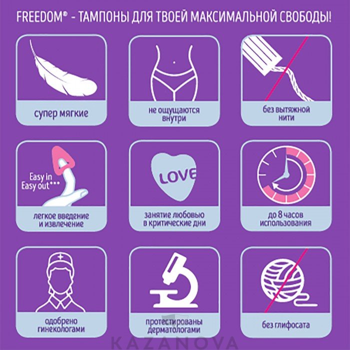 Если ты недавно начала встречаться с мужчиной и не готова портить романтику физиологическими откровениями, то тампоны Freedom Love, Sport, Spa, Swim Normal – идеальное решение. Не отказывайся от удовольствия во время менструации!