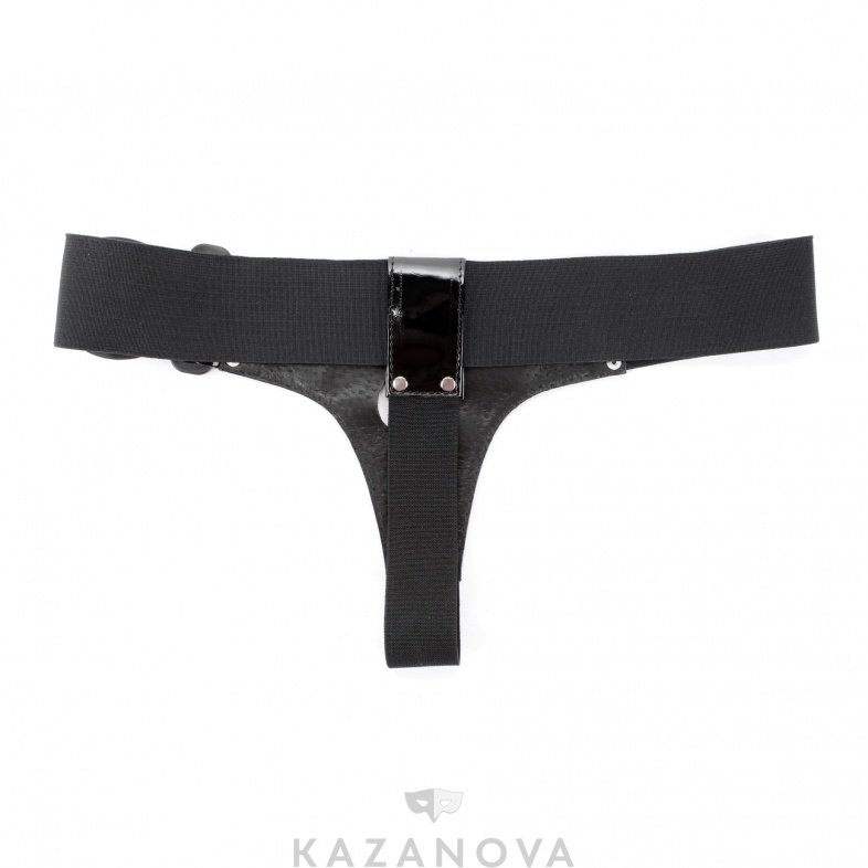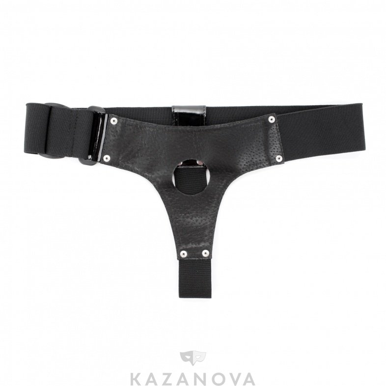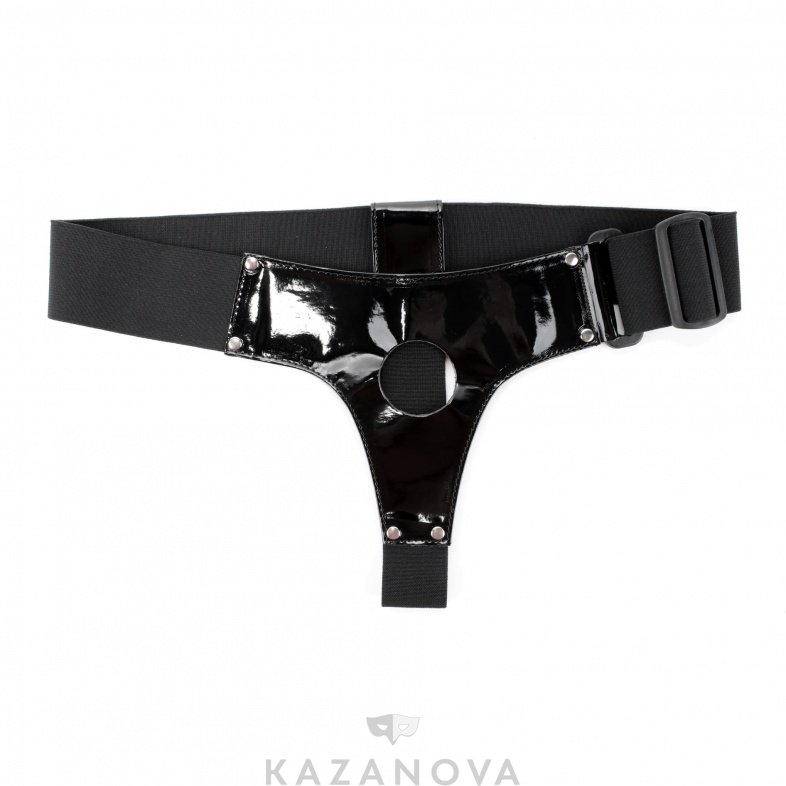 Трусики для страпона Арсенал из натуральной кожи-лаке с отверстием для страпона черные диаметр 4 см