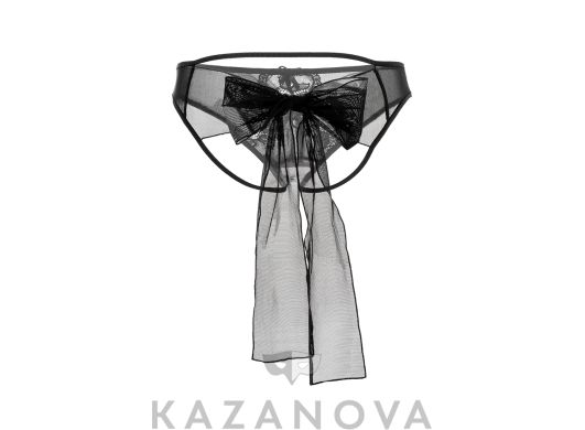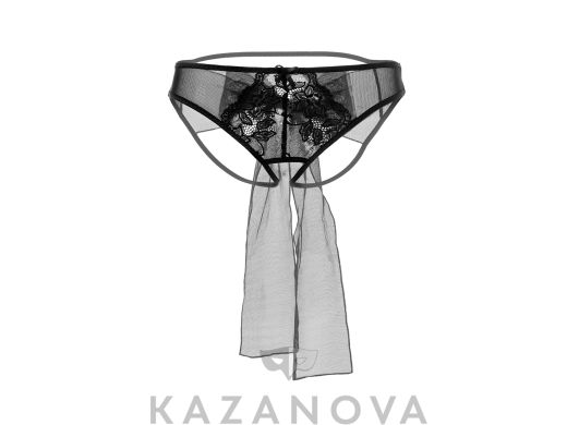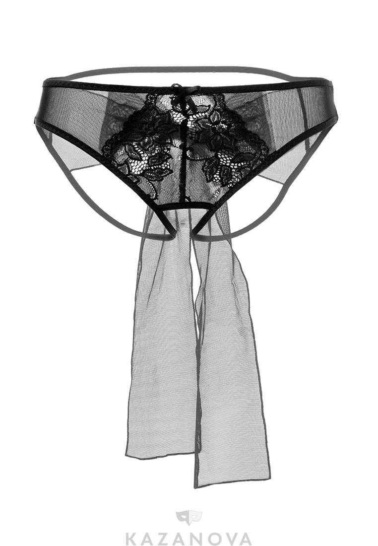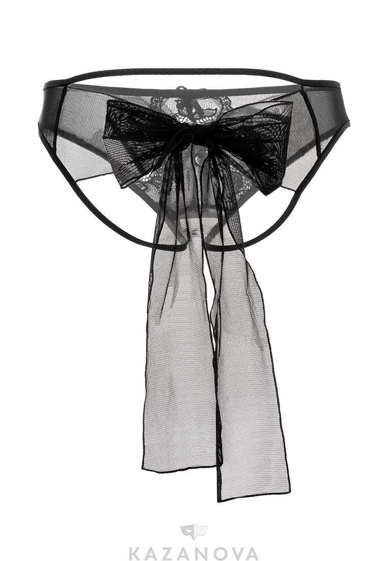 Трусики изготовлены из эластичной ткани черного цвета и плотно облегают тело. Имеют доступ к интимной зоне.